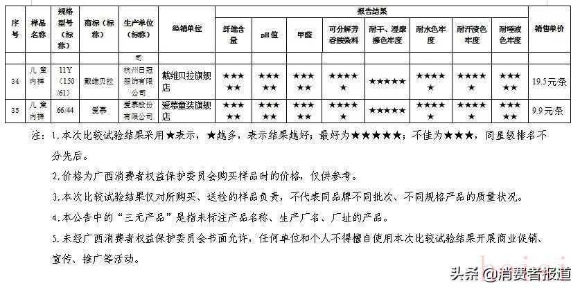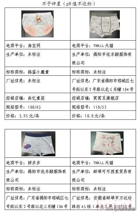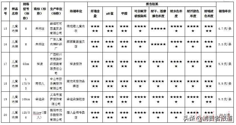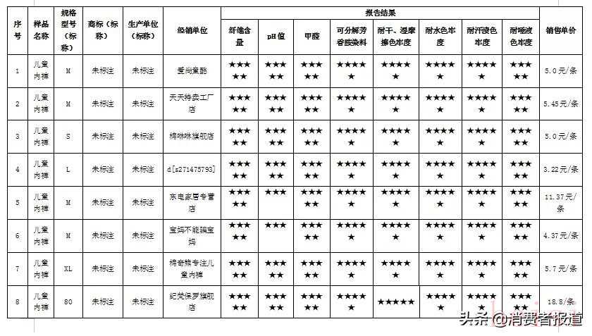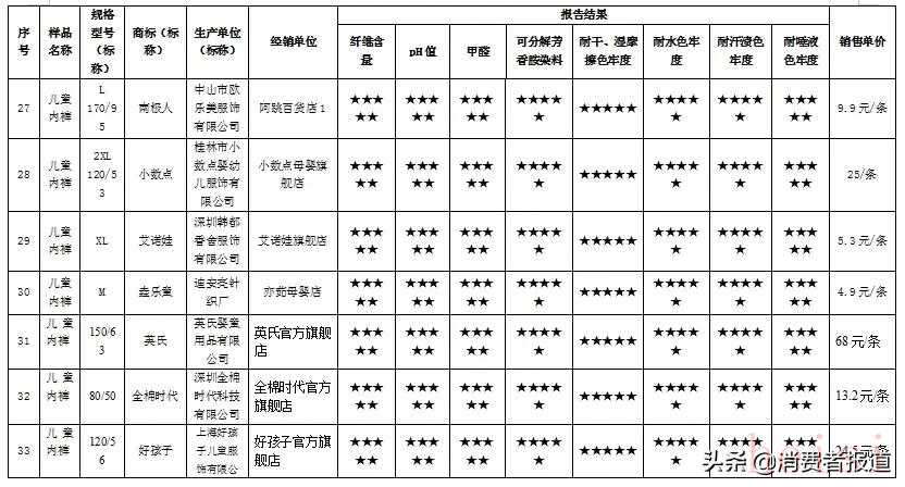 測試結(jié)果顯示,35款網(wǎng)售兒童內(nèi)褲樣品,其中18款表現(xiàn)優(yōu)秀獲五星,3款表現(xiàn)較好獲四星;3款表現(xiàn)良好獲三星;7款屬于“三無”產(chǎn)品(其中2款pH值不符合國家標(biāo)準(zhǔn)),不予評星;4款pH值檢測結(jié)果不符合國家標(biāo)準(zhǔn),不予評星。測試結(jié)果僅對比較試驗(yàn)購買的樣品負(fù)責(zé)。