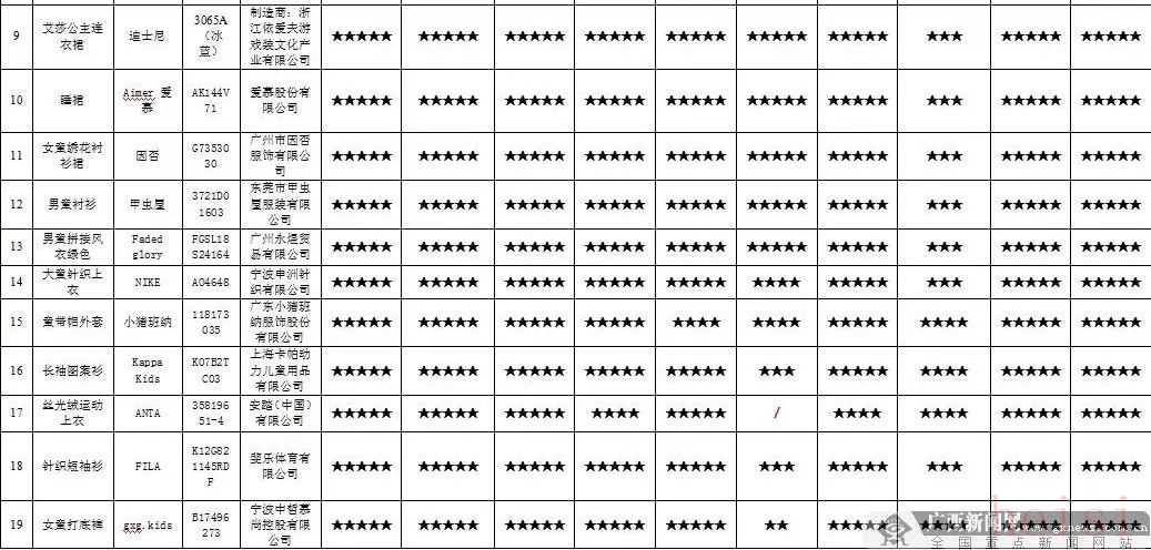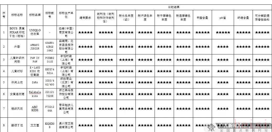 27款兒童服裝比較試驗(yàn)結(jié)果一覽表