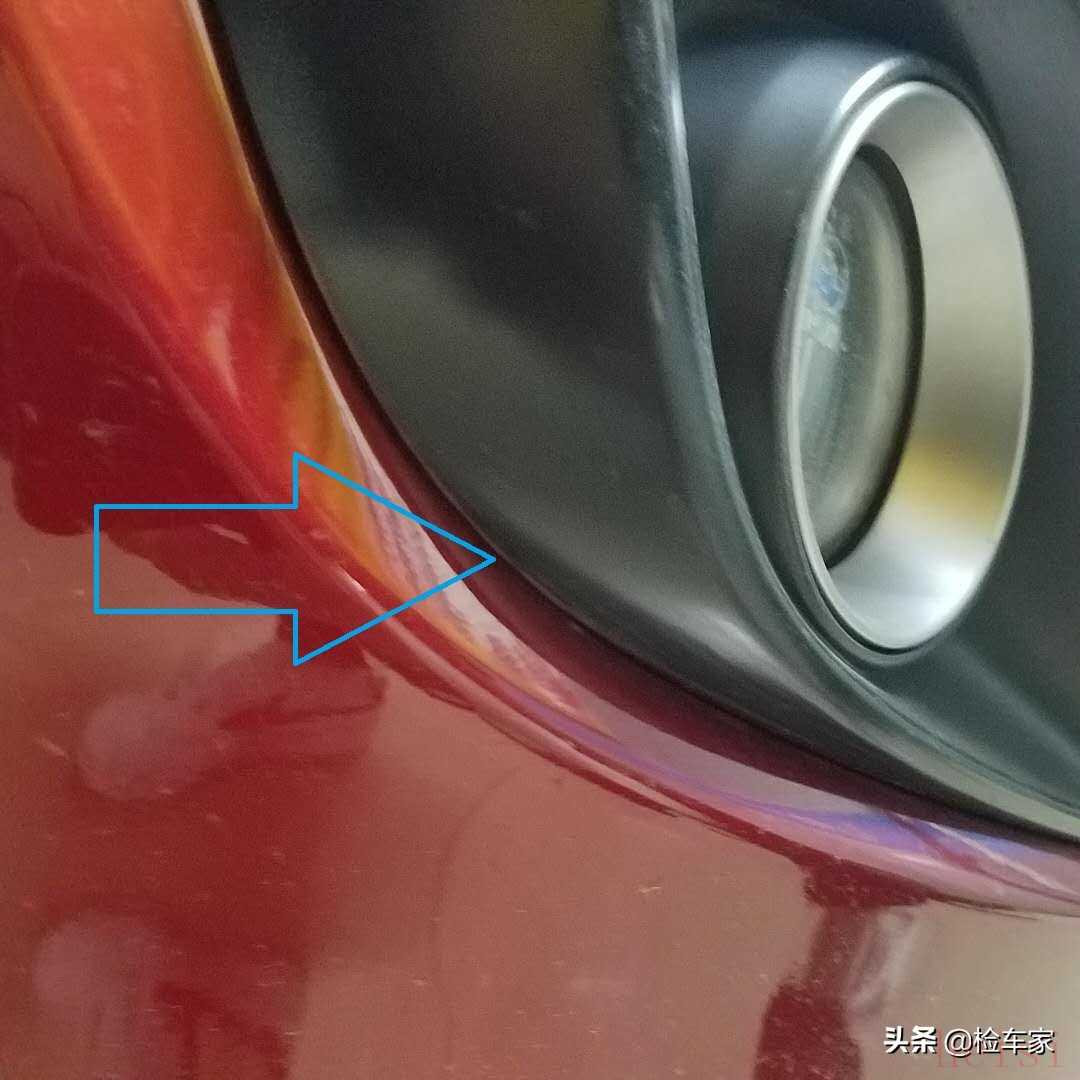 檢查發(fā)現(xiàn),前杠有后噴漆時(shí)產(chǎn)生的飛漆,但是一般高端品牌在正規(guī)的店修理時(shí)就不會(huì)有這樣的瑕疵,因?yàn)閲娖釙r(shí)廠里的技師會(huì)把附件全部拆掉,再進(jìn)行噴涂。