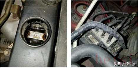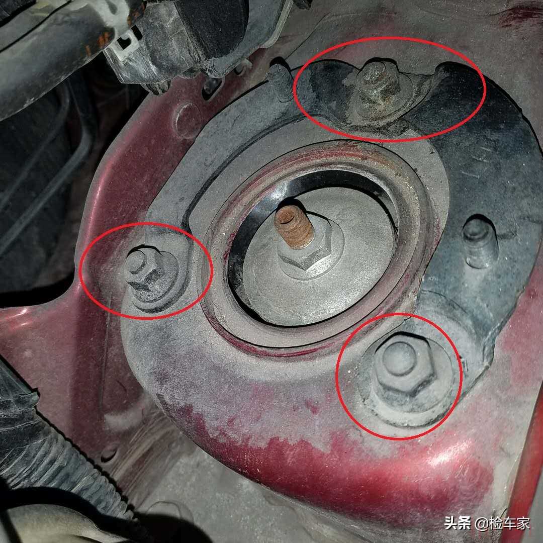 接下來(lái)看一下發(fā)動(dòng)機(jī)艙里的懸架塔頂,發(fā)現(xiàn)減震器有拆卸,8多年的車換個(gè)減震很正常,需要區(qū)別的就是,到底是為什么換。