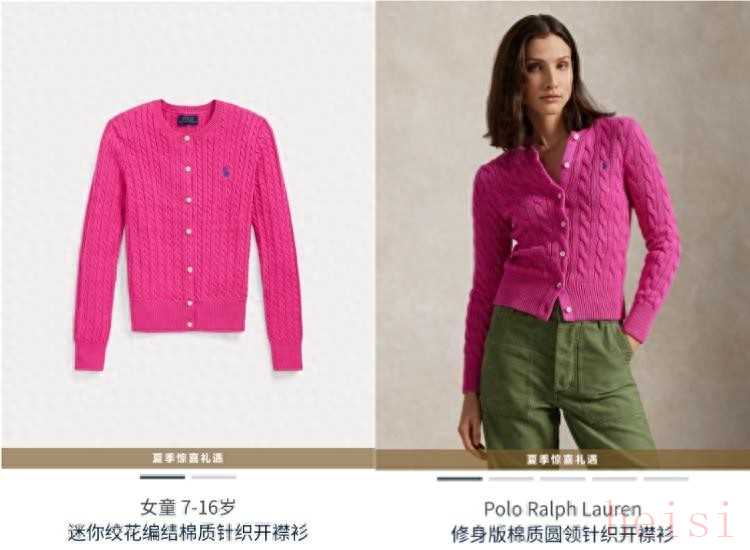 以拉夫勞倫品牌為例,紅星資本局瀏覽其官方線上商城發(fā)現(xiàn),一款玫紅色的圓領(lǐng)針織開(kāi)襟衫,成人款的售價(jià)為1393元,童裝款的售價(jià)為973元,兩者相差420元。