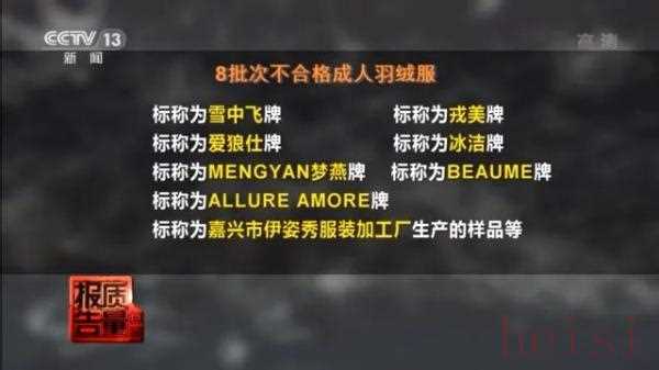 經(jīng)檢測,8批次成人羽絨服不合格,包括標(biāo)稱為雪中飛牌、戎美牌、愛狼仕牌、冰潔牌等樣品。