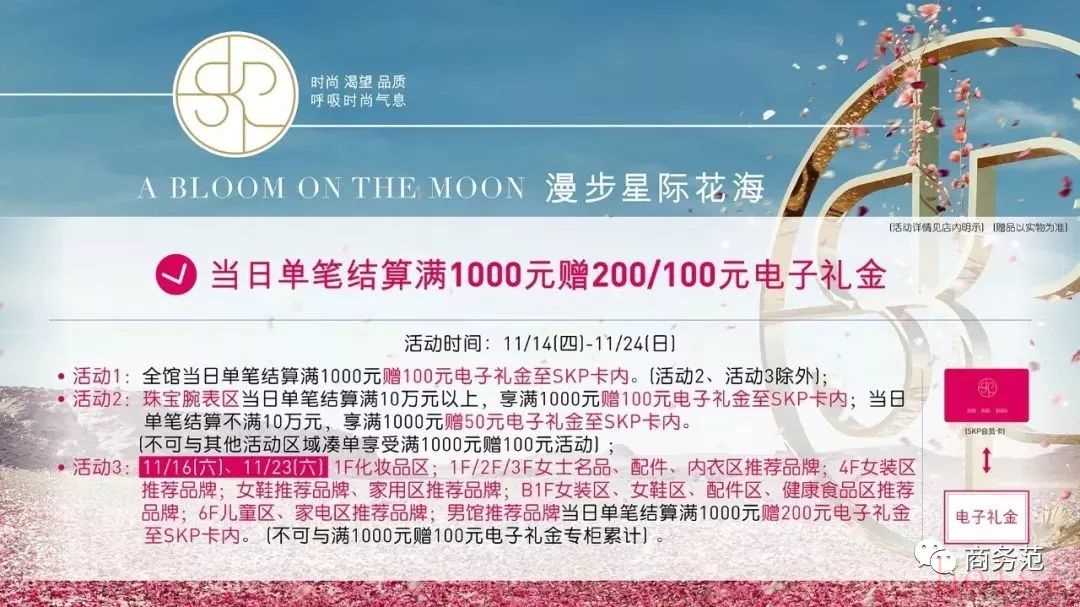 SKP店慶最重要的優(yōu)惠活動(dòng)是滿千返百,每消費(fèi)1000元,就會(huì)返100元的電子禮金,可以疊加使用,在商場(chǎng)里繼續(xù)消費(fèi)。
