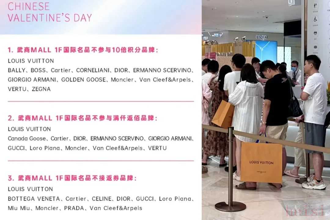 8月10日是個(gè)周六,又恰逢自帶流量的七夕,自然是各大商場(chǎng)的“兵家必爭(zhēng)之地”。但兩天前,LV武商MALL店,就在店門口張貼了公告稱:“路易威登未參加8月10日至11日期間武商MALL所舉辦的十倍積分及滿仟返佰等活動(dòng)?!盠V公關(guān)團(tuán)隊(duì)回應(yīng)媒體,表示品牌沒有被提前告知相關(guān)活動(dòng),發(fā)現(xiàn)后遂叫停。