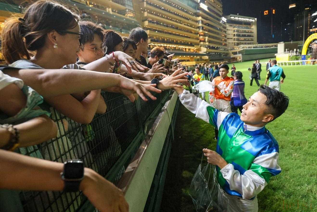 一眾騎師向場內(nèi)馬迷致意并派發(fā)紀(jì)念品,慶祝2024/2025馬季圓滿結(jié)束。