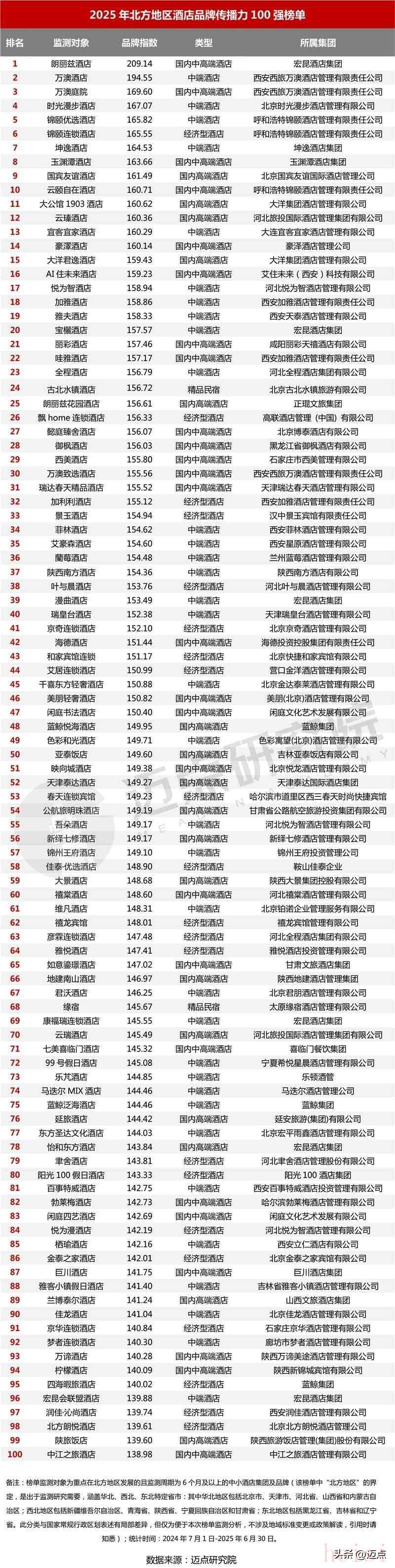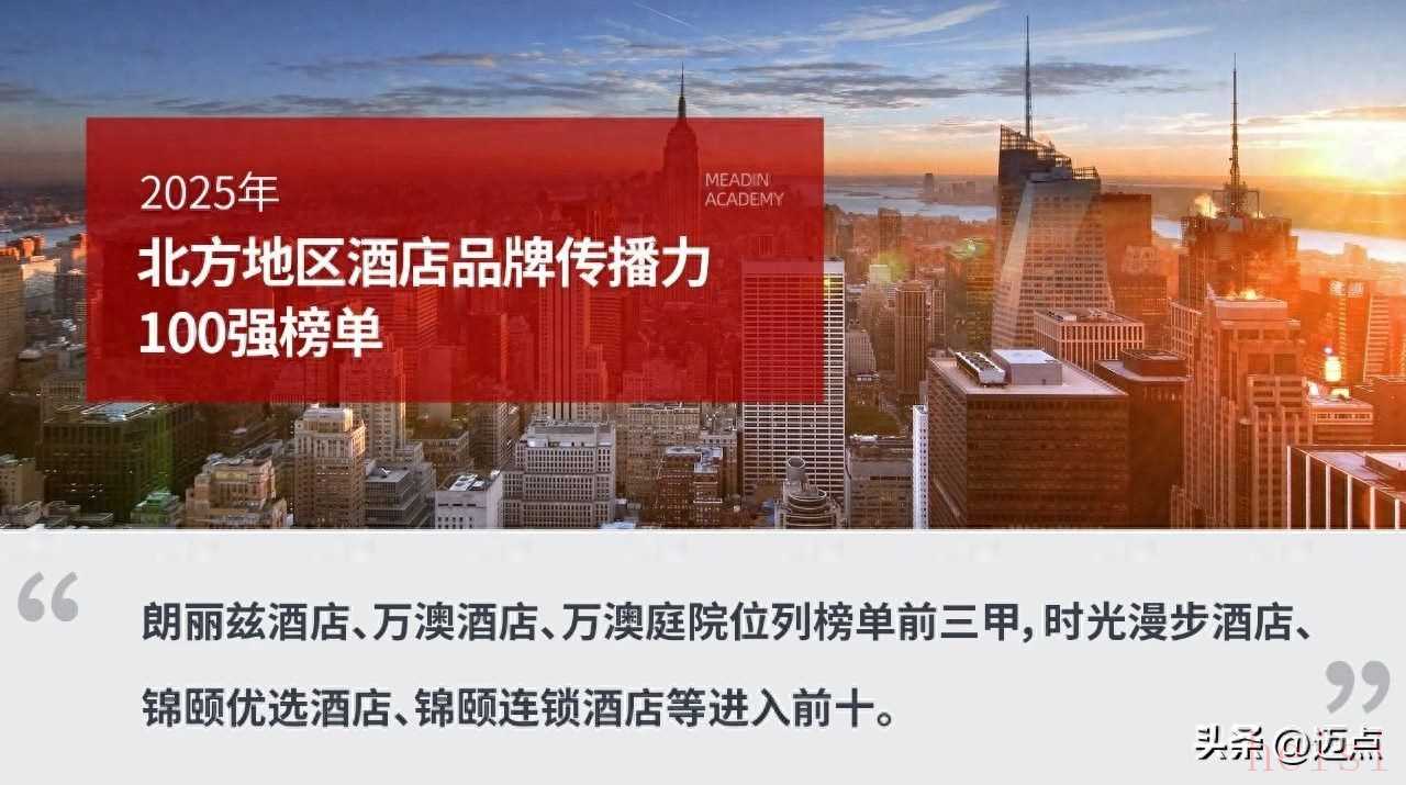 邁點研究院發(fā)布“2025年北方地區(qū)酒店品牌傳播力100強榜單”,朗麗茲酒店、萬澳酒店、萬澳庭院位列榜單前三。榜單競爭格局呈現(xiàn)多元態(tài)勢,各類型酒店憑借自身優(yōu)勢占據(jù)市場一席之地:國內(nèi)高端酒店如國賓友誼酒店、大公館1903酒店、云瑧酒店等,依托集團資源深耕高端市場,品牌指數(shù)均在160以上,展現(xiàn)出強勁的傳播力;中端酒店如時光漫步酒店、錦頤優(yōu)選酒店、坤逸酒店等,憑借精準的市場定位與優(yōu)質(zhì)的品質(zhì)服務脫穎而出,在榜單中占據(jù)多個席位;國內(nèi)中高端酒店如朗麗茲酒店、萬澳庭院、玉淵潭酒店等,以獨特的品牌調(diào)性與個性化服務吸引品質(zhì)客群,其中朗麗茲酒店更是以209.14的品牌指數(shù)位居榜首;經(jīng)濟型酒店如錦頤連鎖酒店、飄home連鎖酒店、景玉酒店等,以高性價比及創(chuàng)新服務贏得市場認可,在榜單中形成穩(wěn)定的競爭力量;精品民宿如古北水鎮(zhèn)酒店、緣宿等,依托地域特色與獨特體驗提升傳播力,為北方地區(qū)酒店市場注入差異化活力。各層級酒店協(xié)同發(fā)展,共同構(gòu)成了北方地區(qū)豐富多元的酒店市場生態(tài)。