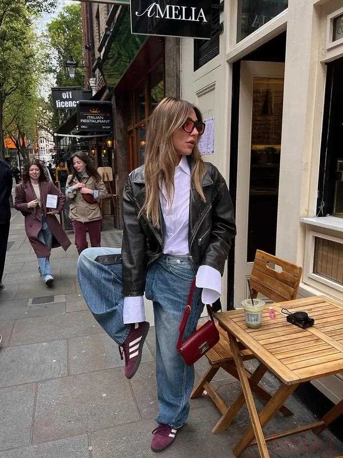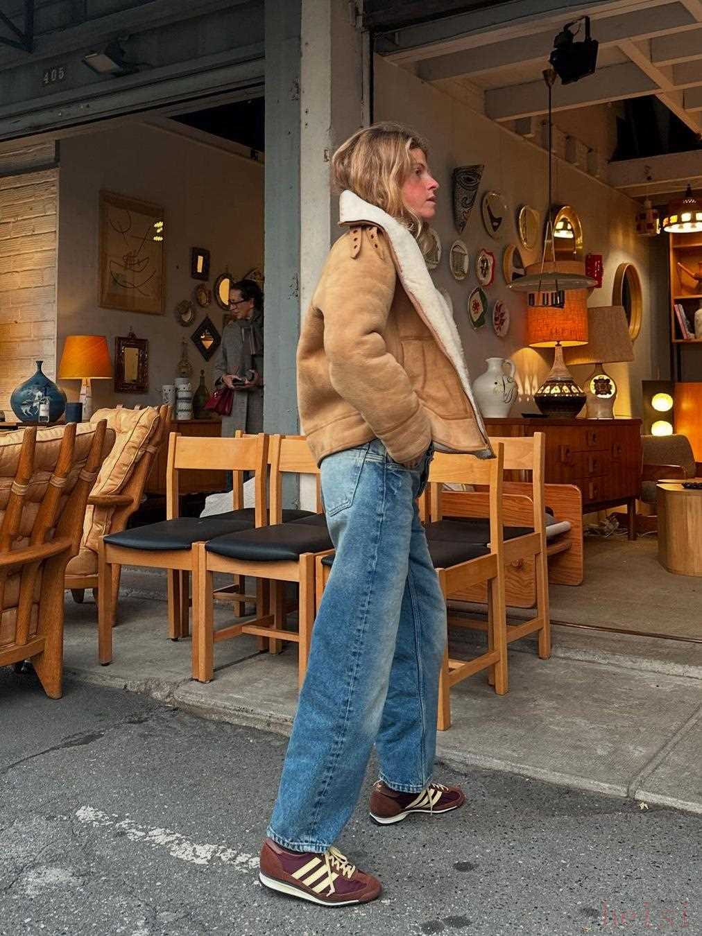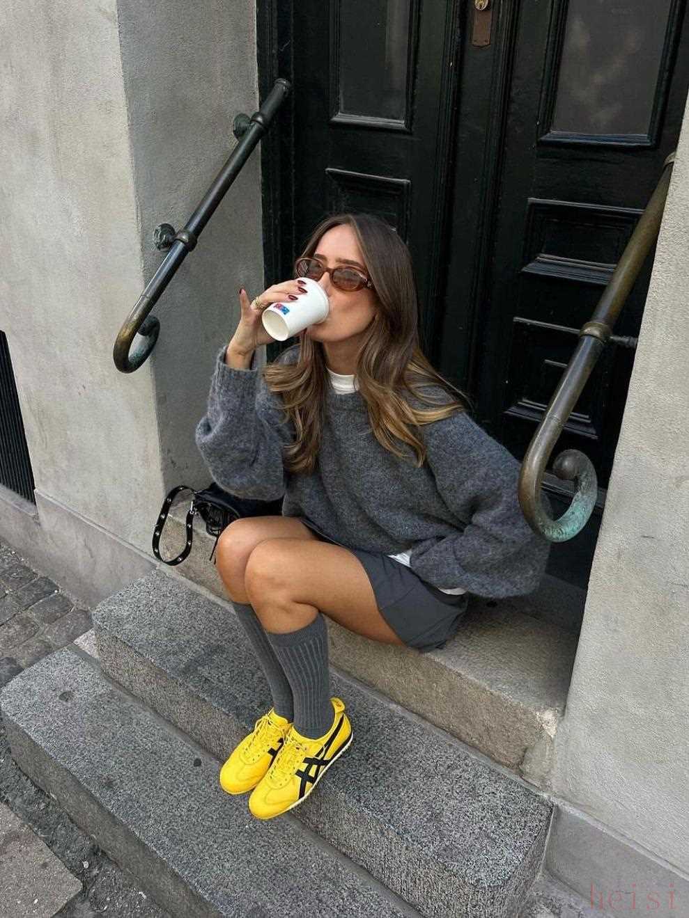如果喜歡運(yùn)動(dòng)機(jī)能風(fēng),還可以參考博主Sasha的這套造型,用復(fù)古夾克搭配Diesel高領(lǐng)針織衫,最后以亮黃色的鬼?;⑦\(yùn)動(dòng)鞋完裝,極致演繹颯爽姿態(tài)。
