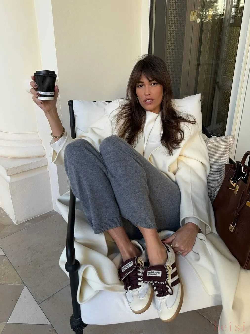 更日常的方式還是用白色長(zhǎng)褲與運(yùn)動(dòng)鞋完裝,此種穿搭中會(huì)更建議大家選一款麂皮運(yùn)動(dòng)鞋,可以讓造型顯得復(fù)古時(shí)髦又不乏摩登氣息。