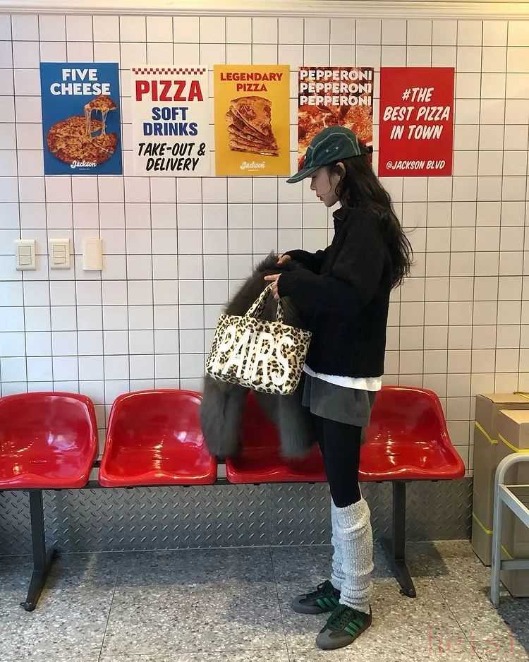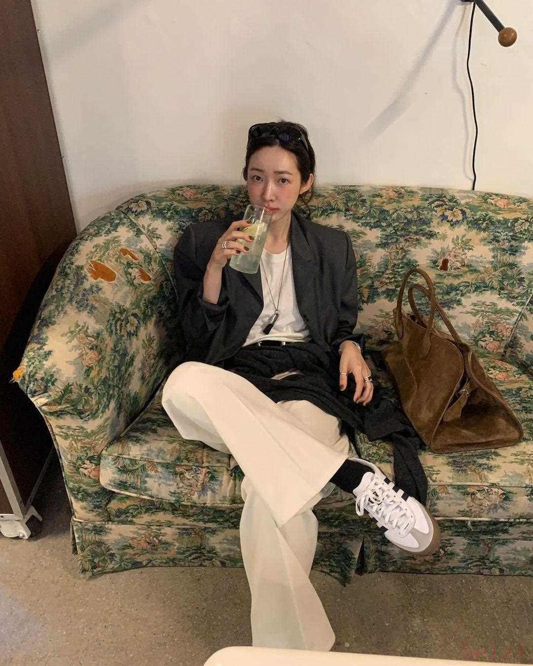 除了復(fù)古感的夾克,西裝同樣也是與運(yùn)動(dòng)鞋適配度滿分的單品,像車靜媛這樣以小白鞋搭配白T恤與黑西裝,再提上麂皮托特包,妥妥拿捏冬季氛圍感。