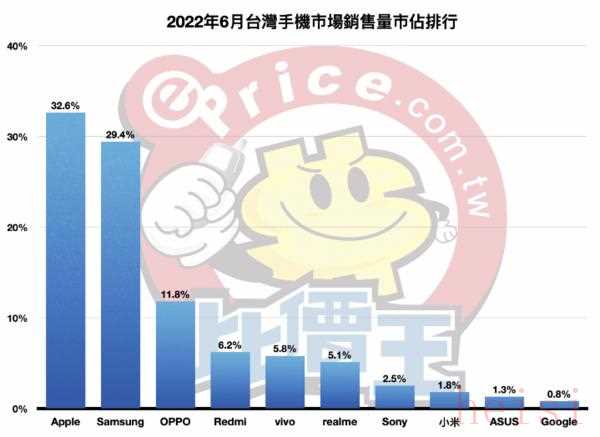 2022年6月臺灣手機市場銷售量市占比排名