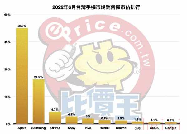 2022年6月臺灣手機市場銷售額市占比排名