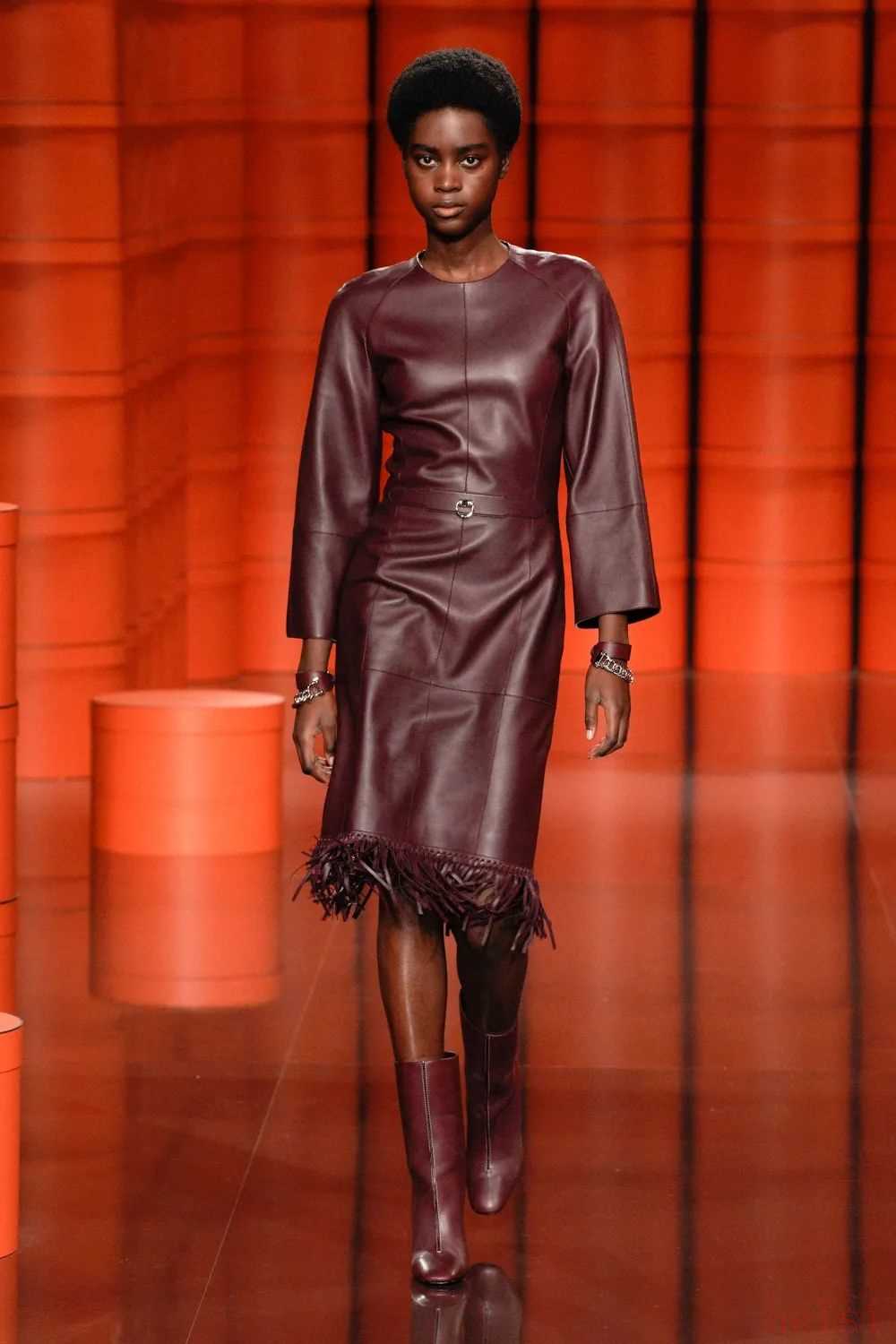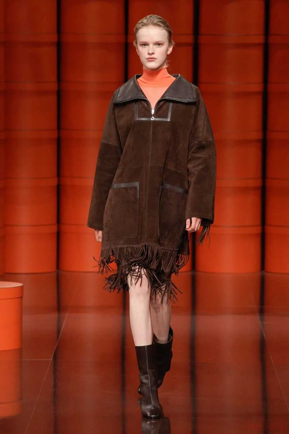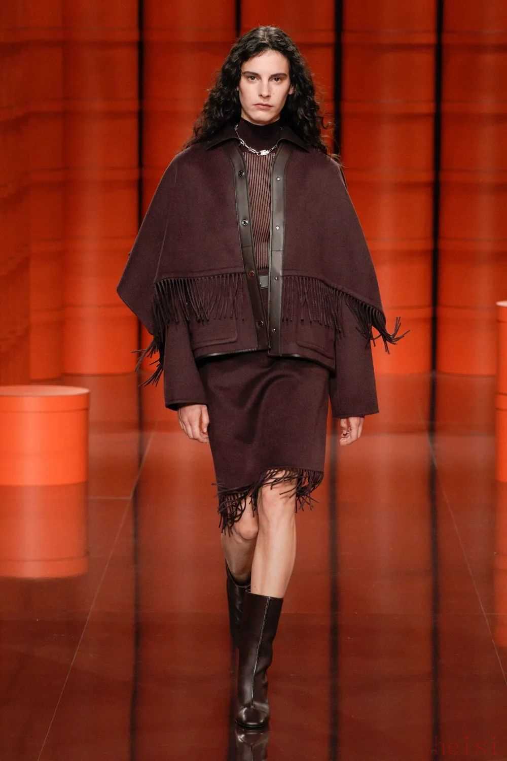 硬朗有型的皮革與柔軟的材質(zhì)拼接在一起,不同材質(zhì)拼接組合為新裝帶來驚喜感,打造溫暖有力量感的冬季套裝。流蘇下擺讓正裝裙更有活力,隨著模特走動時(shí)與身體恰到好處地貼合、擺動,宛如第二層皮膚,柔美自如。