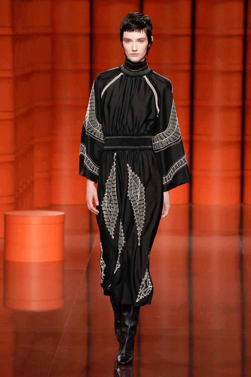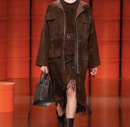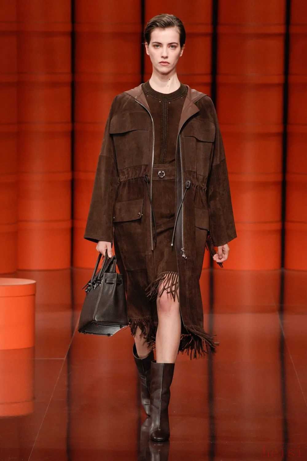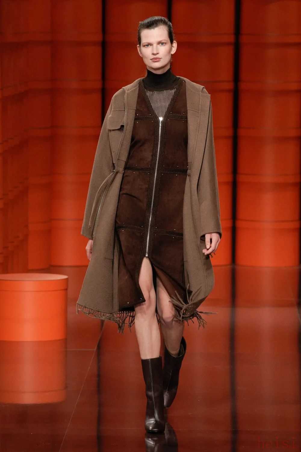 硬朗有型的皮革與柔軟的材質(zhì)拼接在一起,不同材質(zhì)拼接組合為新裝帶來驚喜感,打造溫暖有力量感的冬季套裝。流蘇下擺讓正裝裙更有活力,隨著模特走動時(shí)與身體恰到好處地貼合、擺動,宛如第二層皮膚,柔美自如。