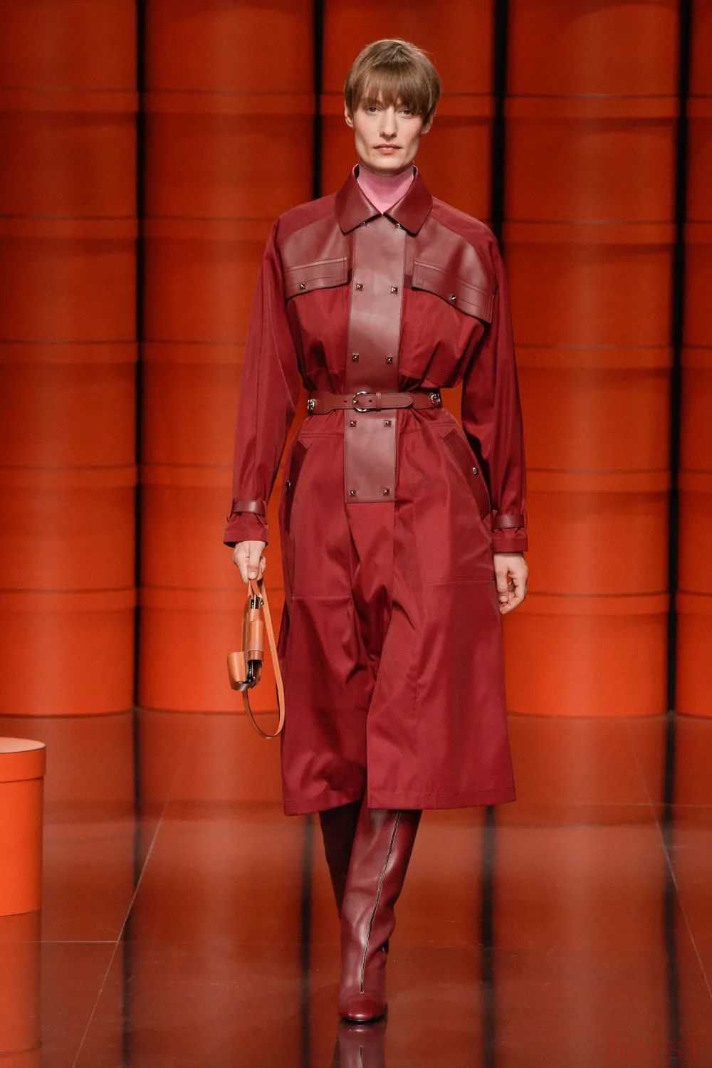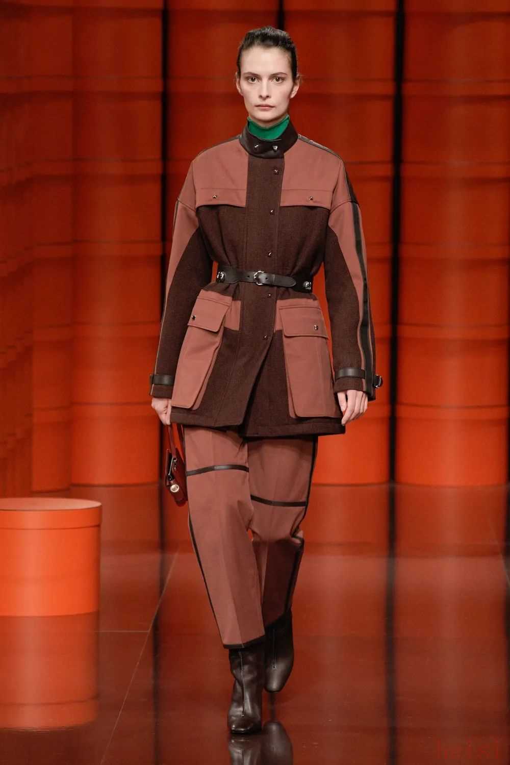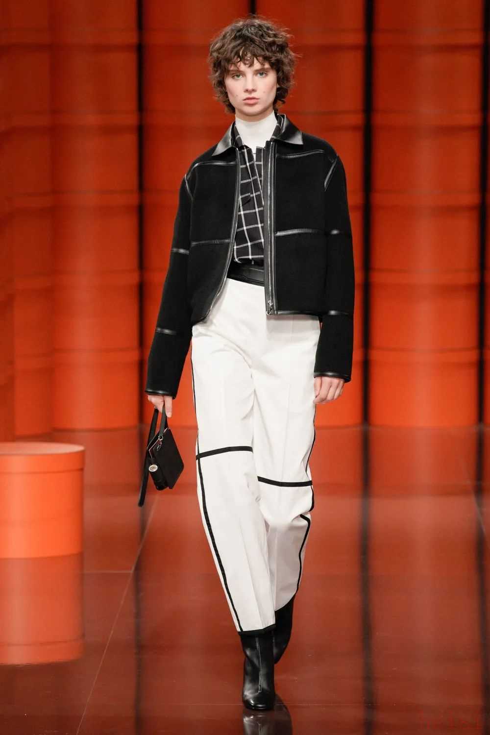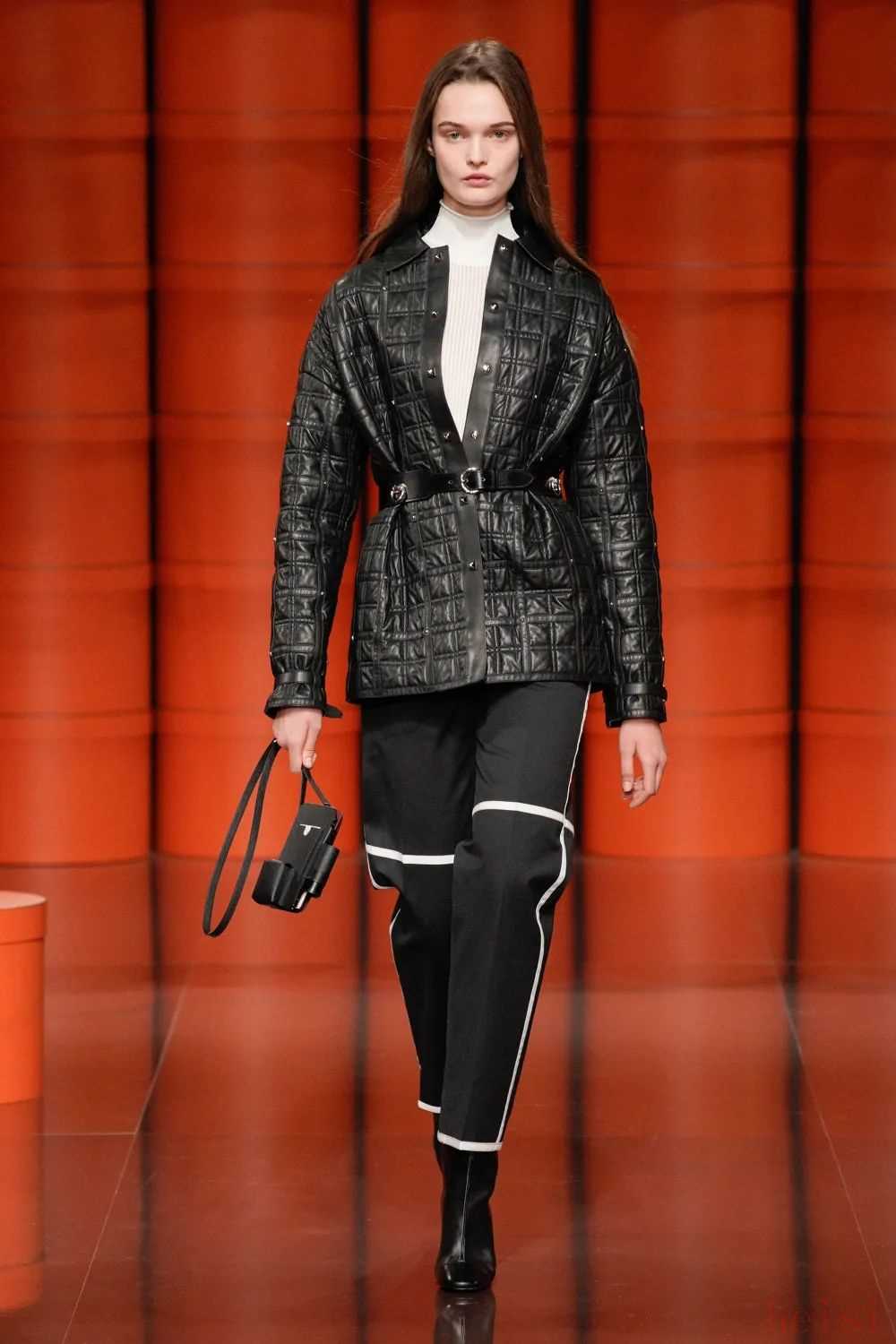 本季利落剪裁的套裝適合全天候穿著,夾棉外套繡上了印花被重現(xiàn)。馬術(shù)風(fēng)格的塔特薩爾格紋圖案解構(gòu)重組猶如一幅畫,搭配皮革,純粹簡約裝點(diǎn)身形。