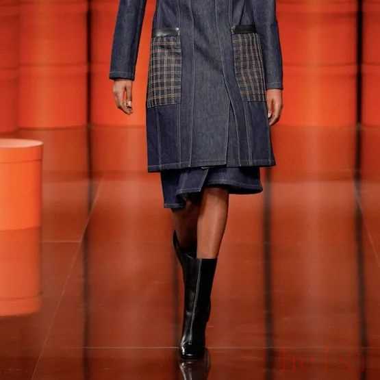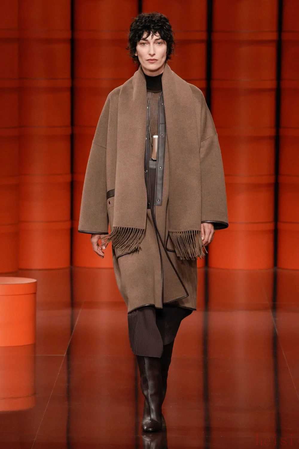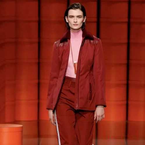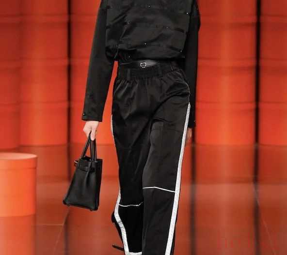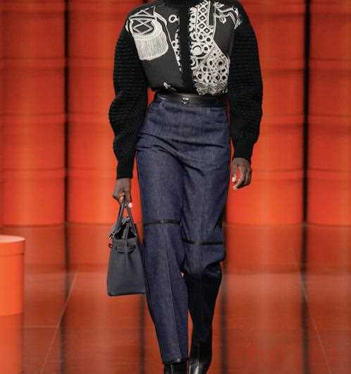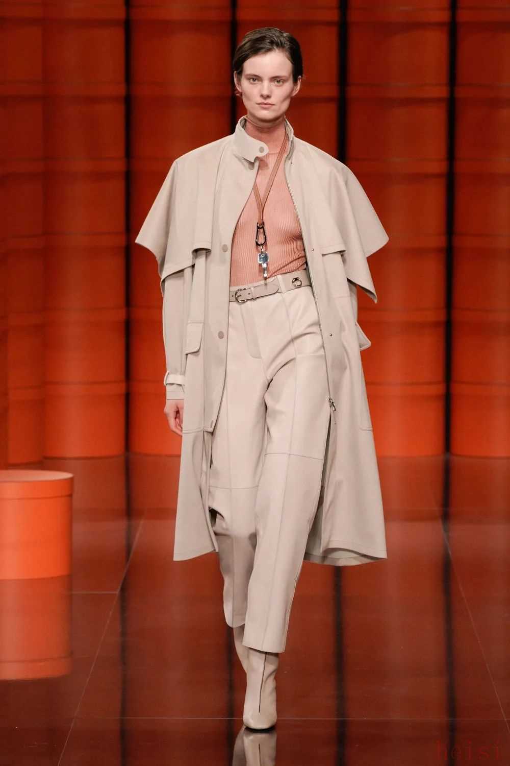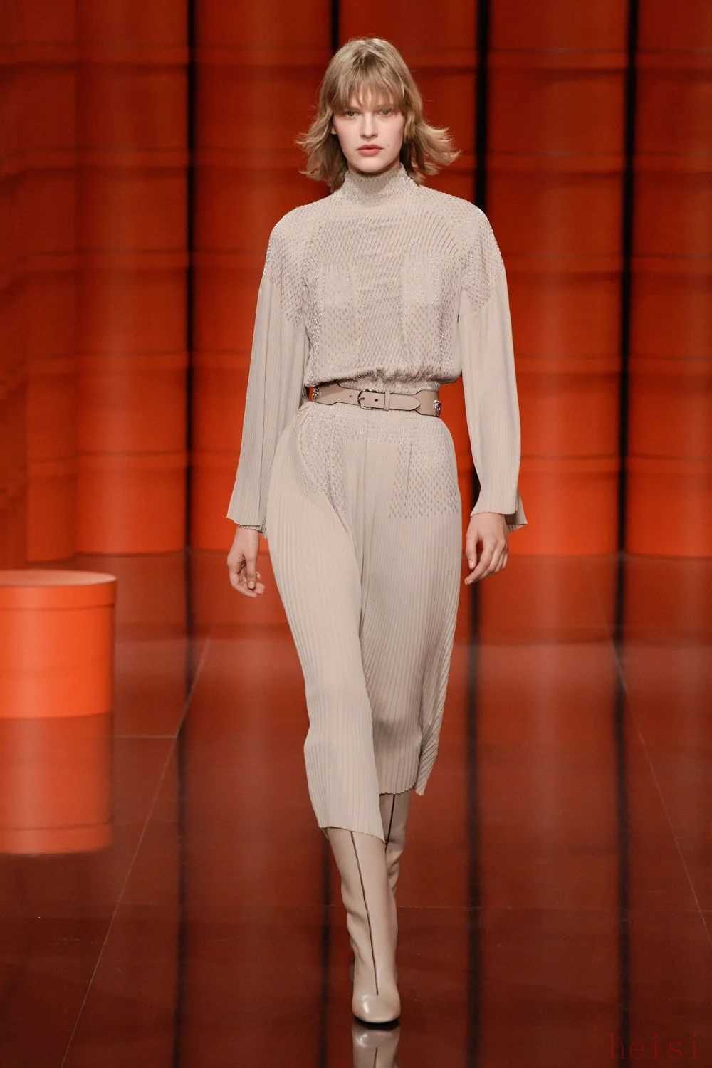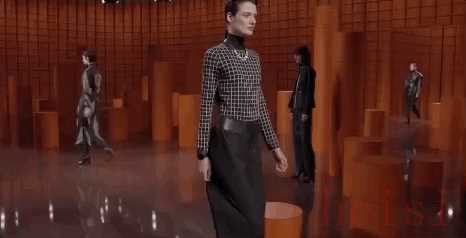 畫面一:T型臺燈光璀璨,模特們身著愛馬仕品牌服飾款款而來。