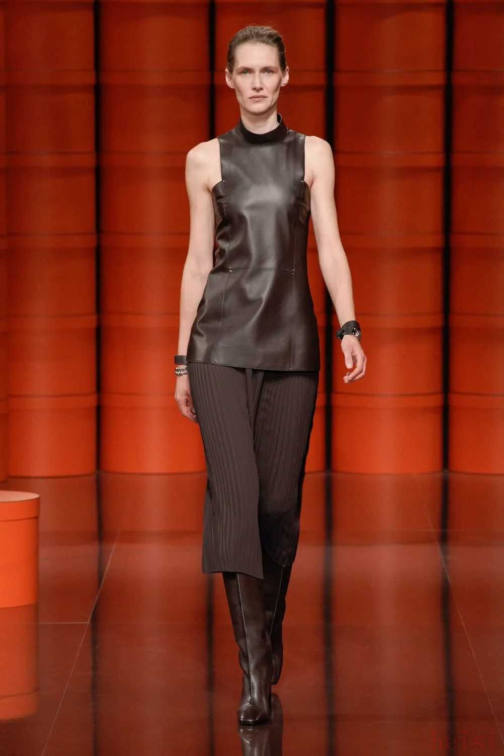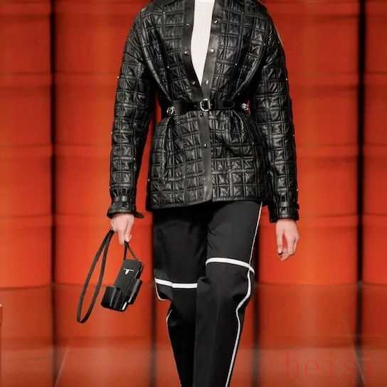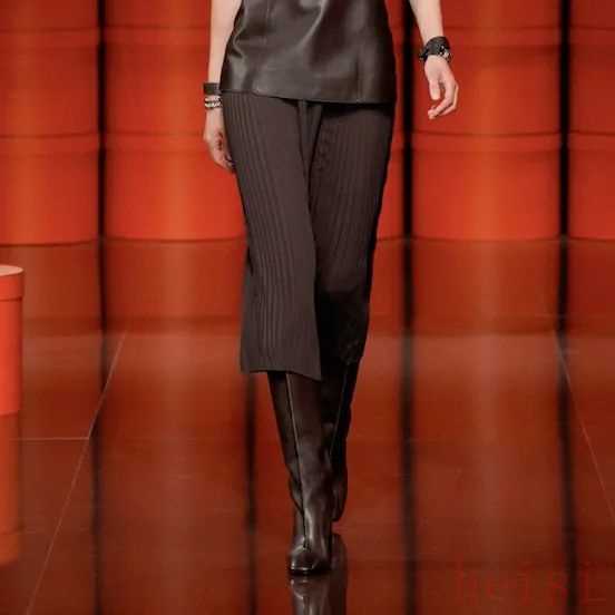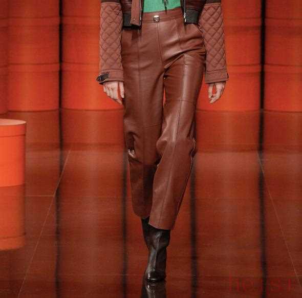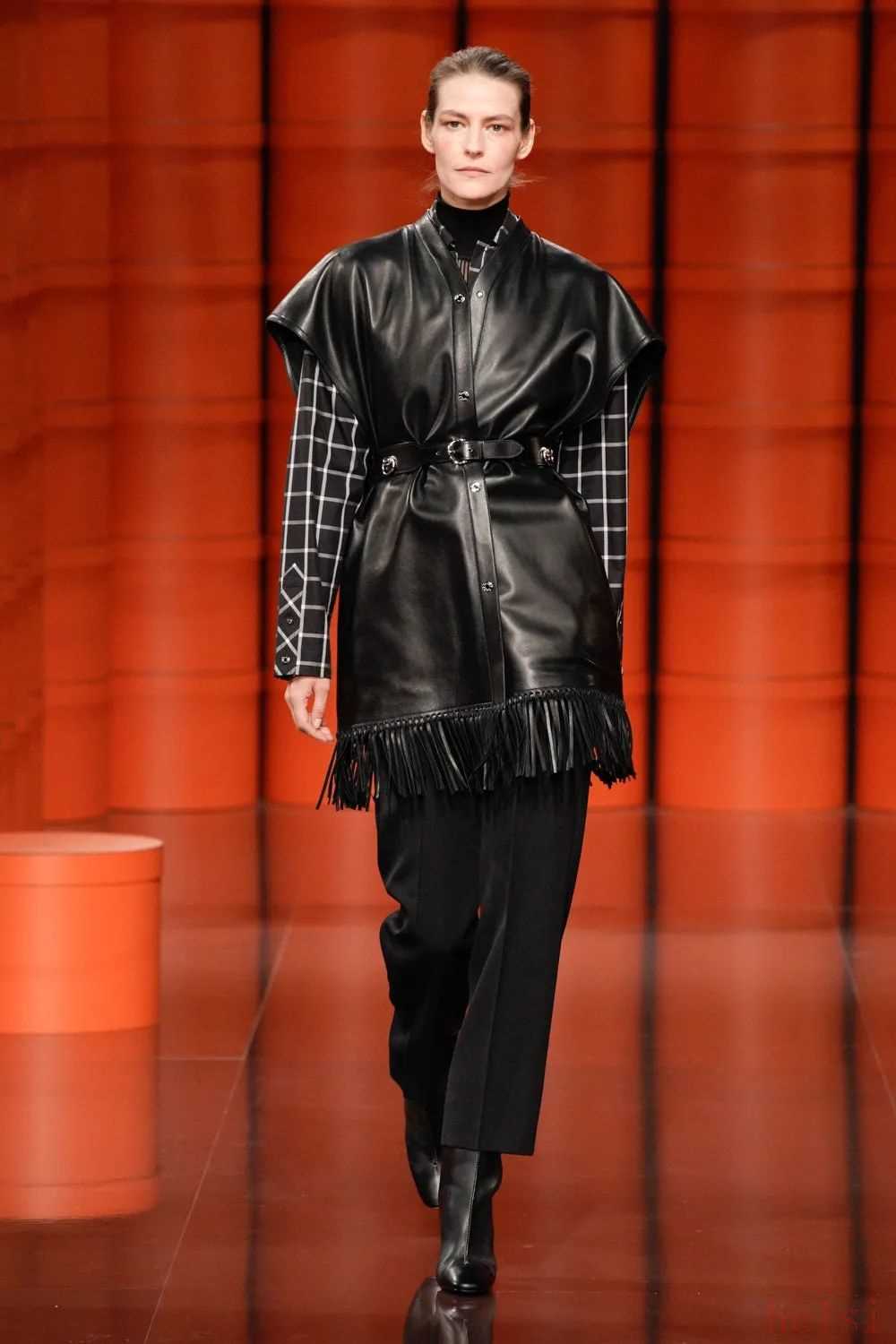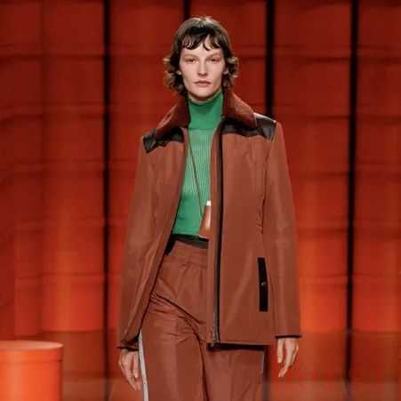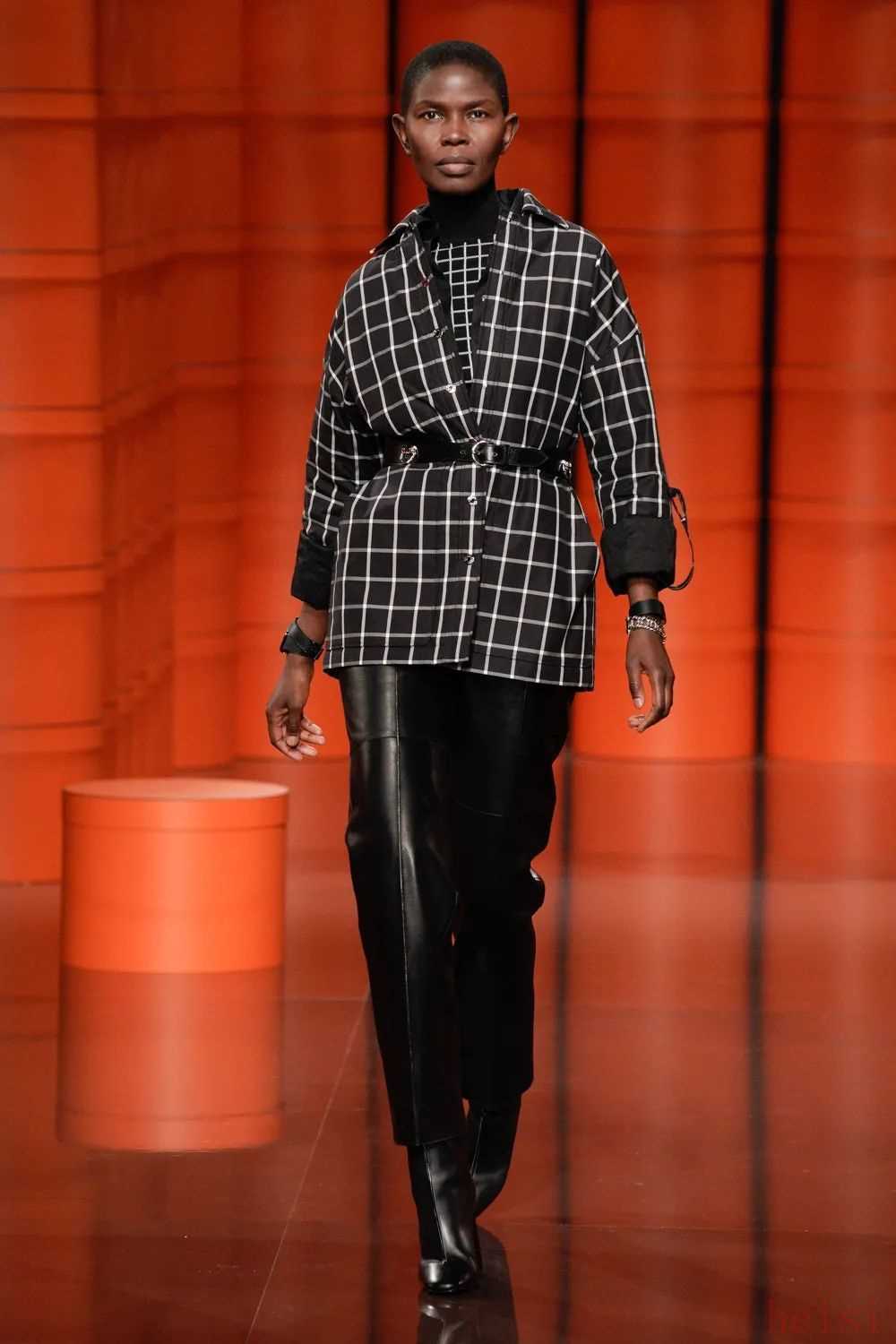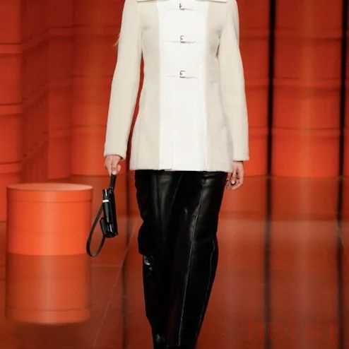 眾所周知,愛馬仕善于制皮,即使皮革運(yùn)用在成衣中也能游刃有余。整場秀隨處可見各種編織和剪裁利落的皮革元素,皮革與菱格衍縫拼接,是颯爽大女人的凌厲氣質(zhì)。