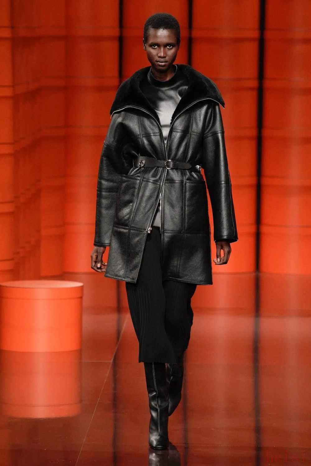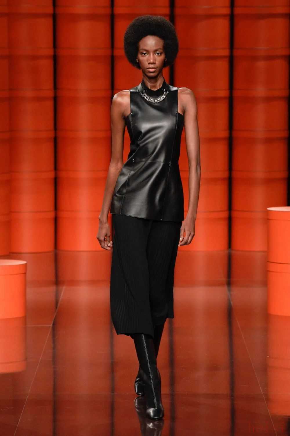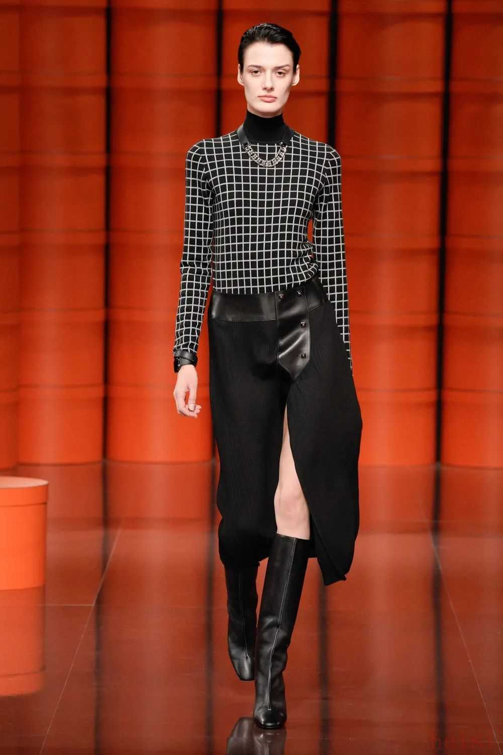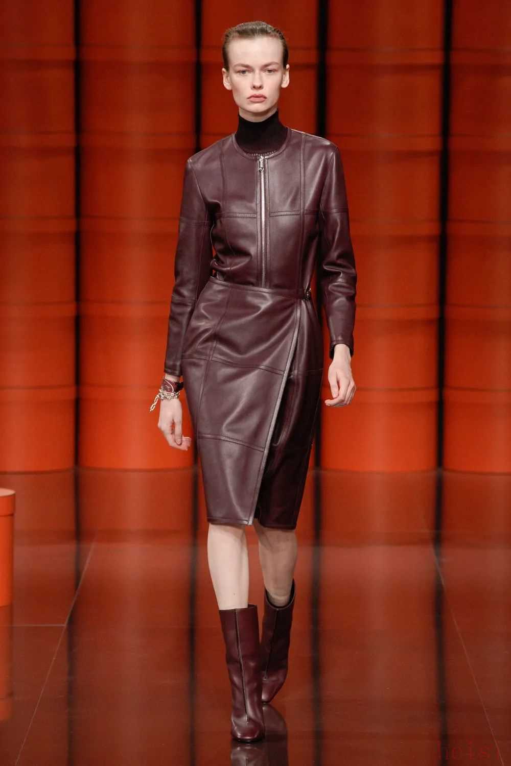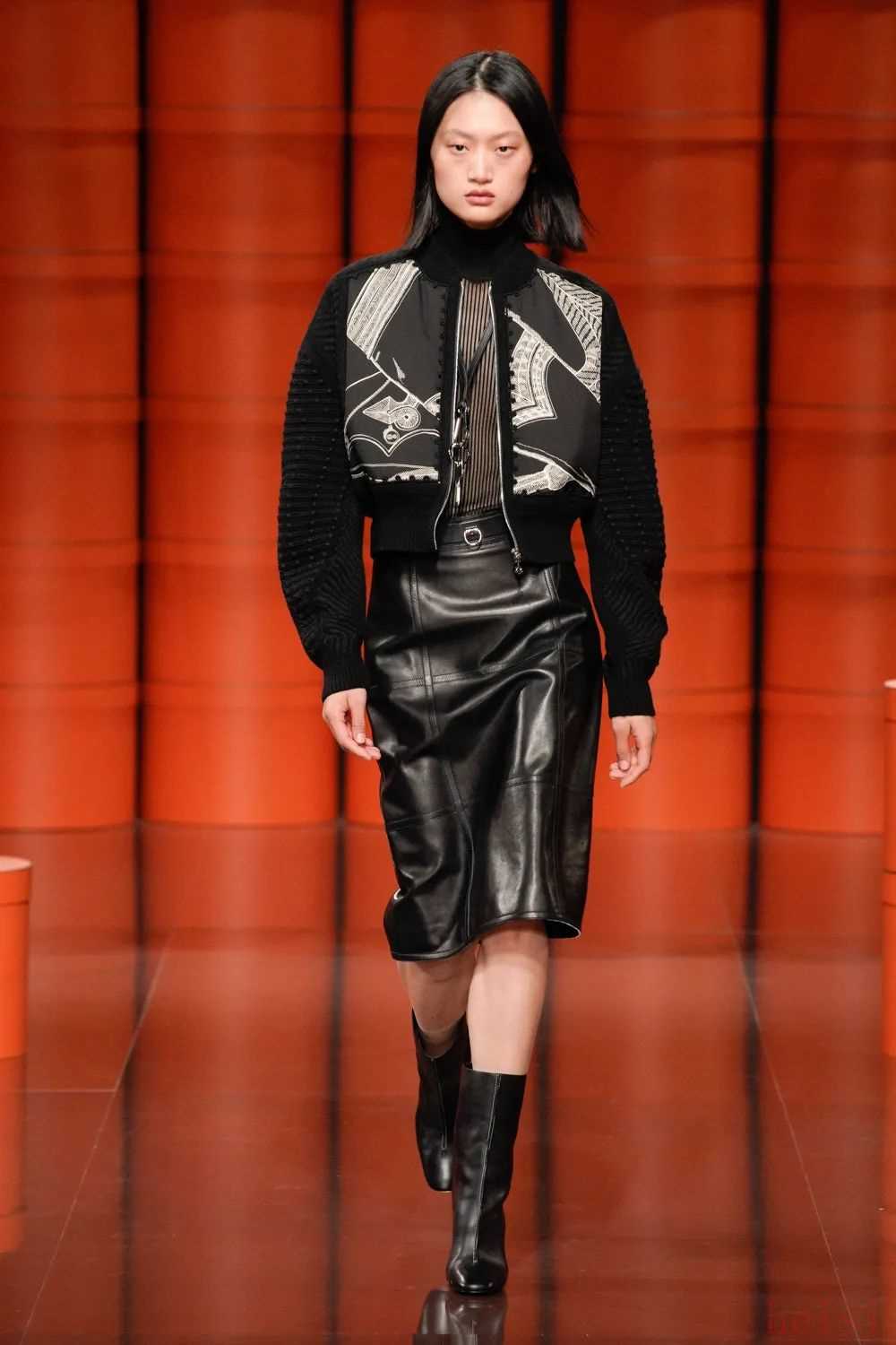 眾所周知,愛馬仕善于制皮,即使皮革運(yùn)用在成衣中也能游刃有余。整場秀隨處可見各種編織和剪裁利落的皮革元素,皮革與菱格衍縫拼接,是颯爽大女人的凌厲氣質(zhì)。