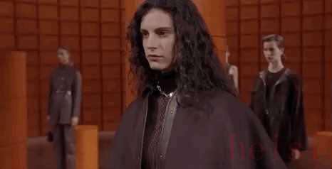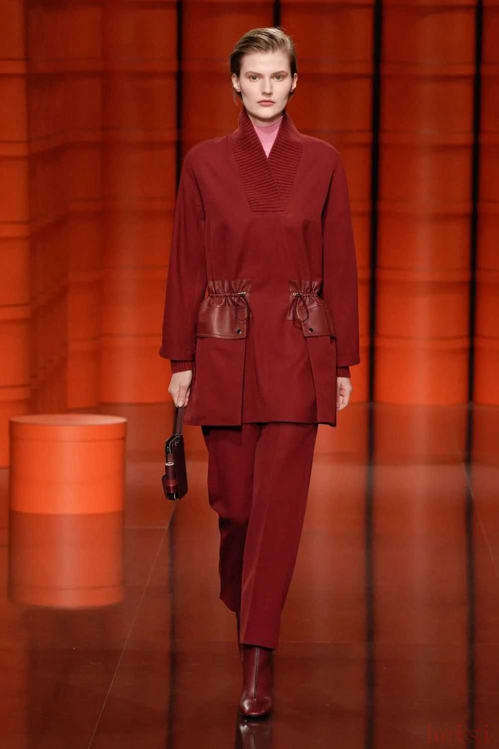 隨著時(shí)間的變化,畫面來到巴黎,愛馬仕經(jīng)典的橙色盒子遍布秀場,模特們身著著最新一季的時(shí)裝穿梭在愛馬仕橙的世界中,凌厲有型。