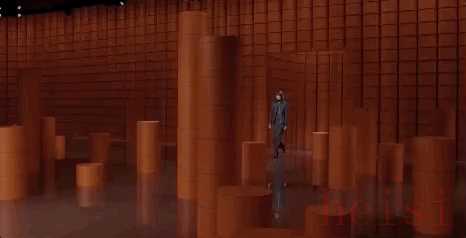 在這里愛馬仕橙色禮盒化身為“積木”,它用不同的方式將它們呈現(xiàn)在觀眾眼前,可以化身為移動的墻壁,以及巧妙轉(zhuǎn)換的隔斷,百變莫測、難以捉摸。這和禮盒的定義也不謀而合,它是一種制造驚喜的方式。
