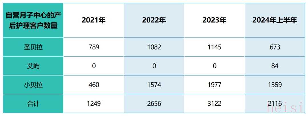 這項策略確實提高了小貝拉的客戶數(shù)量。其每家自營月子中心的平均產(chǎn)后護理客戶數(shù)量從2021年的81人上漲至2023年的100人,2024年上半年為57人,按照這個增速推測,2024年全年應該會超過2023年。