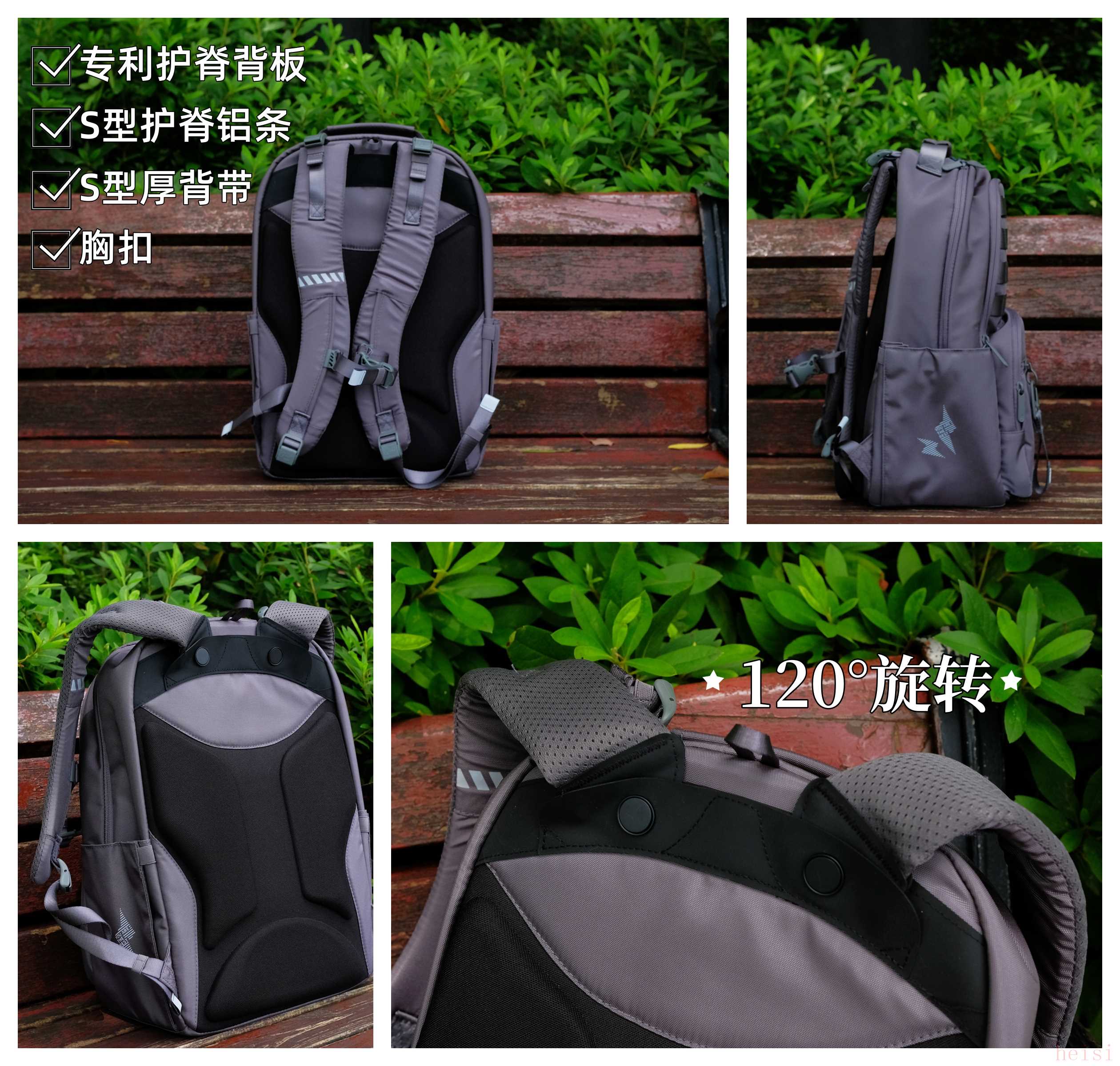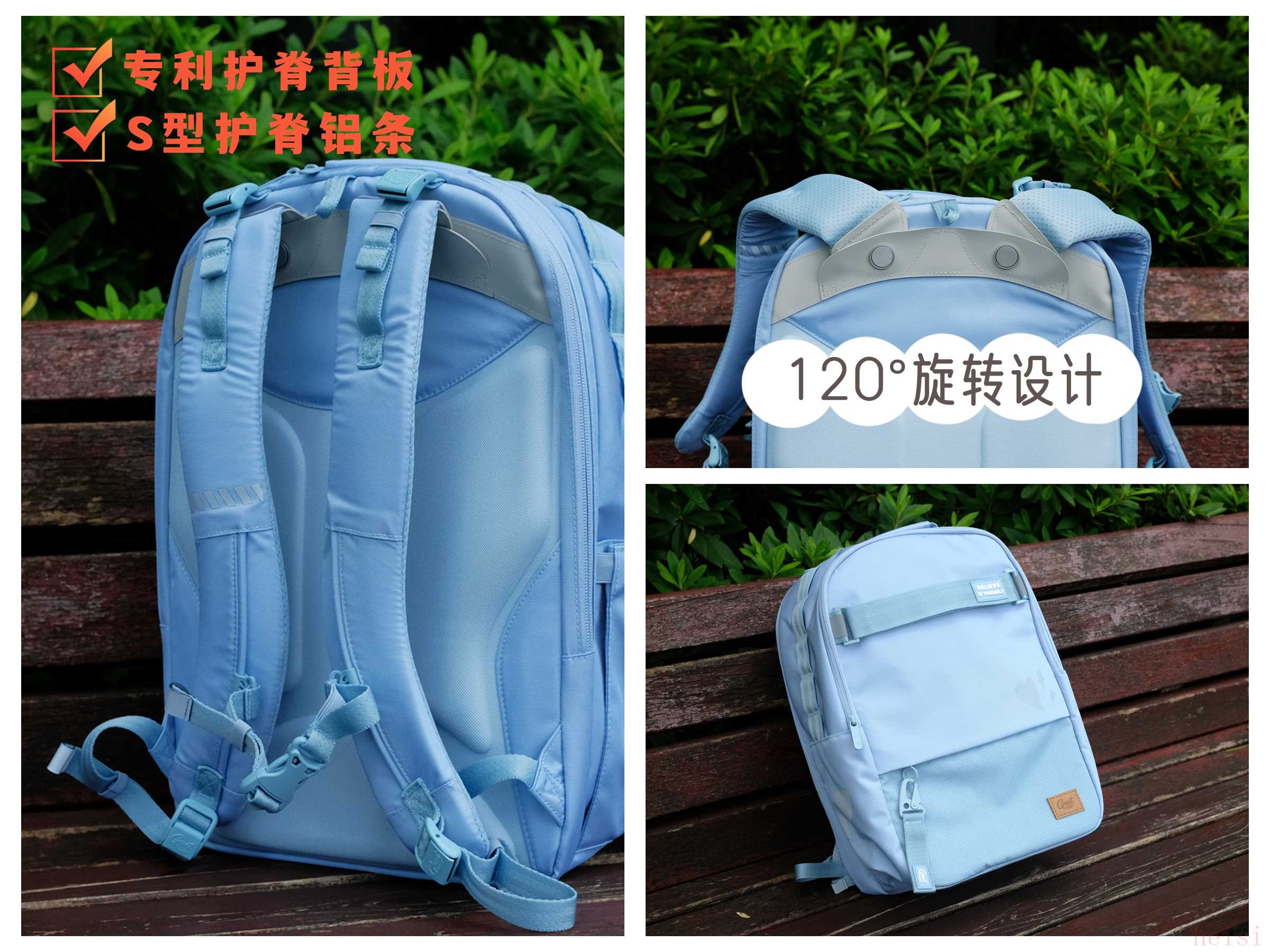 書包的S型肩帶采用了120°旋轉(zhuǎn)設(shè)計(jì),可自由調(diào)節(jié)兩條肩帶間的夾角,配合胸扣,更適合不同肩寬的孩子。一體成型獨(dú)家科技的專利護(hù)脊背板這搭配了S型護(hù)脊鋁條,背板透氣、受力均勻,提升背負(fù)時的舒適度。