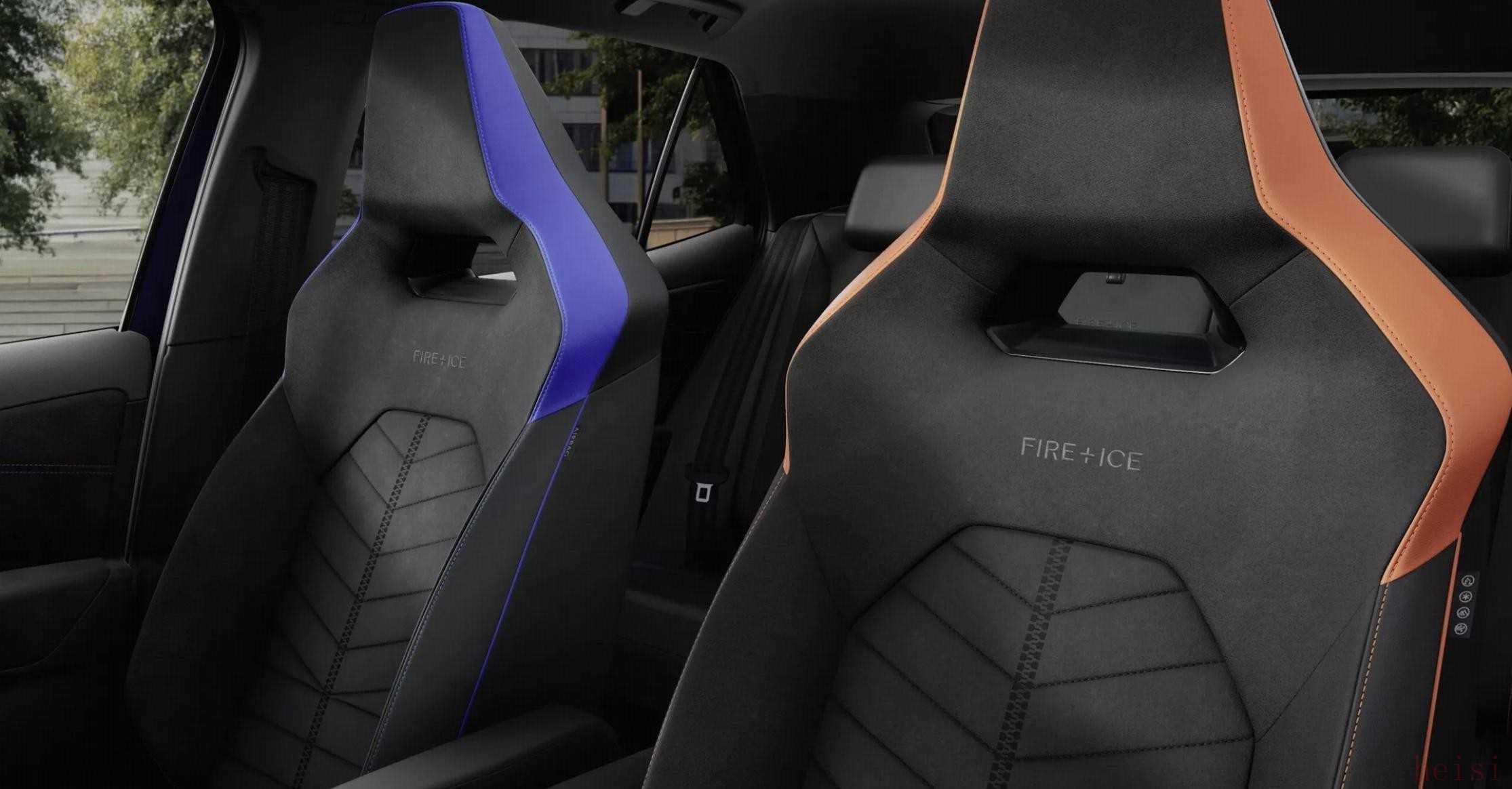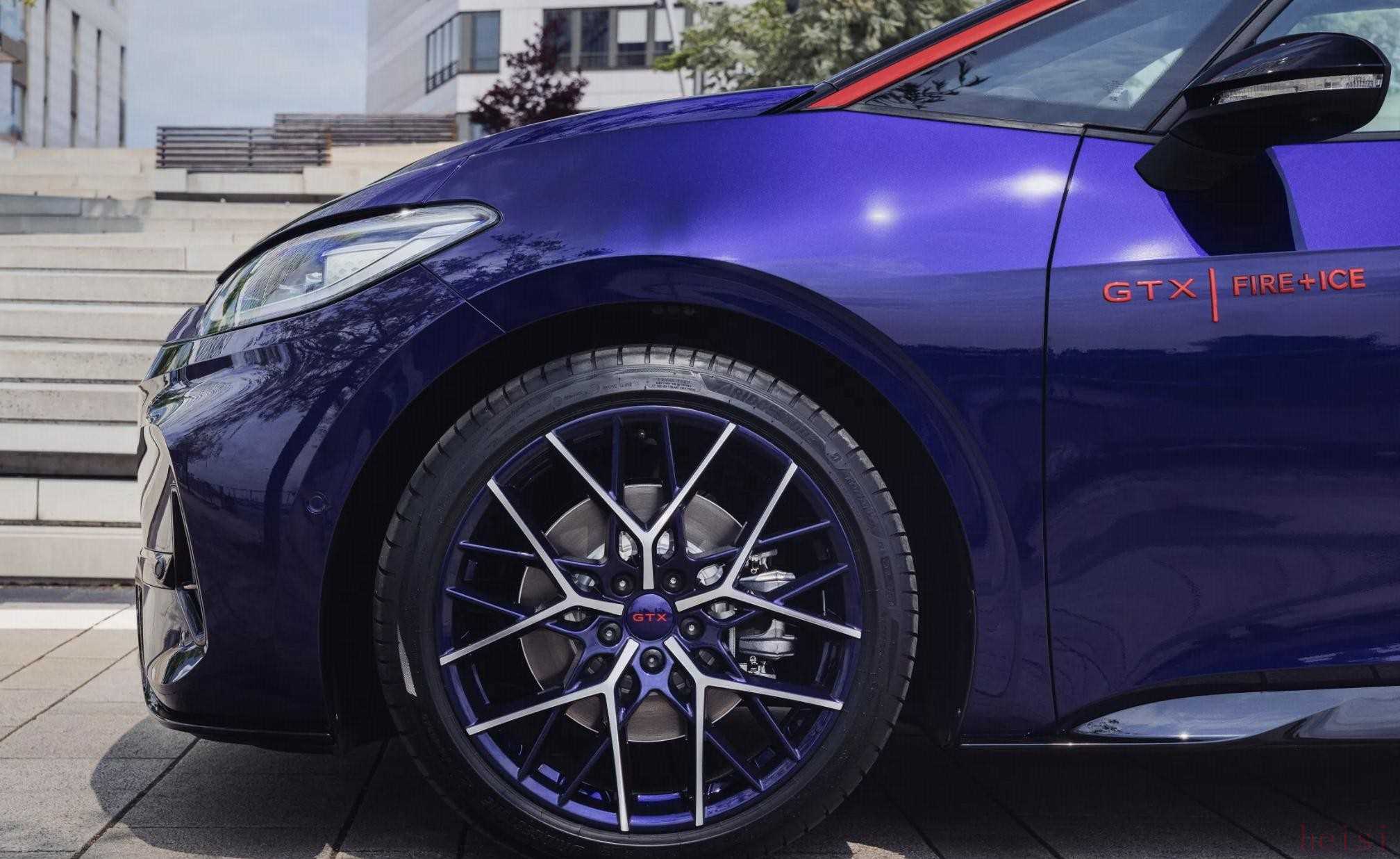車身側(cè)面C柱有專門的拉花貼,后尾翼上寫了FIRE+ICE標(biāo)識,前門也有紅底字的GTX標(biāo)志。車?yán)镒斡昧顺人{(lán)雙色搭配,靠背上縫了同樣的標(biāo)識,座椅背后還有個(gè)拉鏈設(shè)計(jì),聽說是參考了Bogner家的羽絨服。配置上帶哈曼卡頓音響、抬頭顯示和駕駛輔助系統(tǒng),前后排都有加熱功能。
