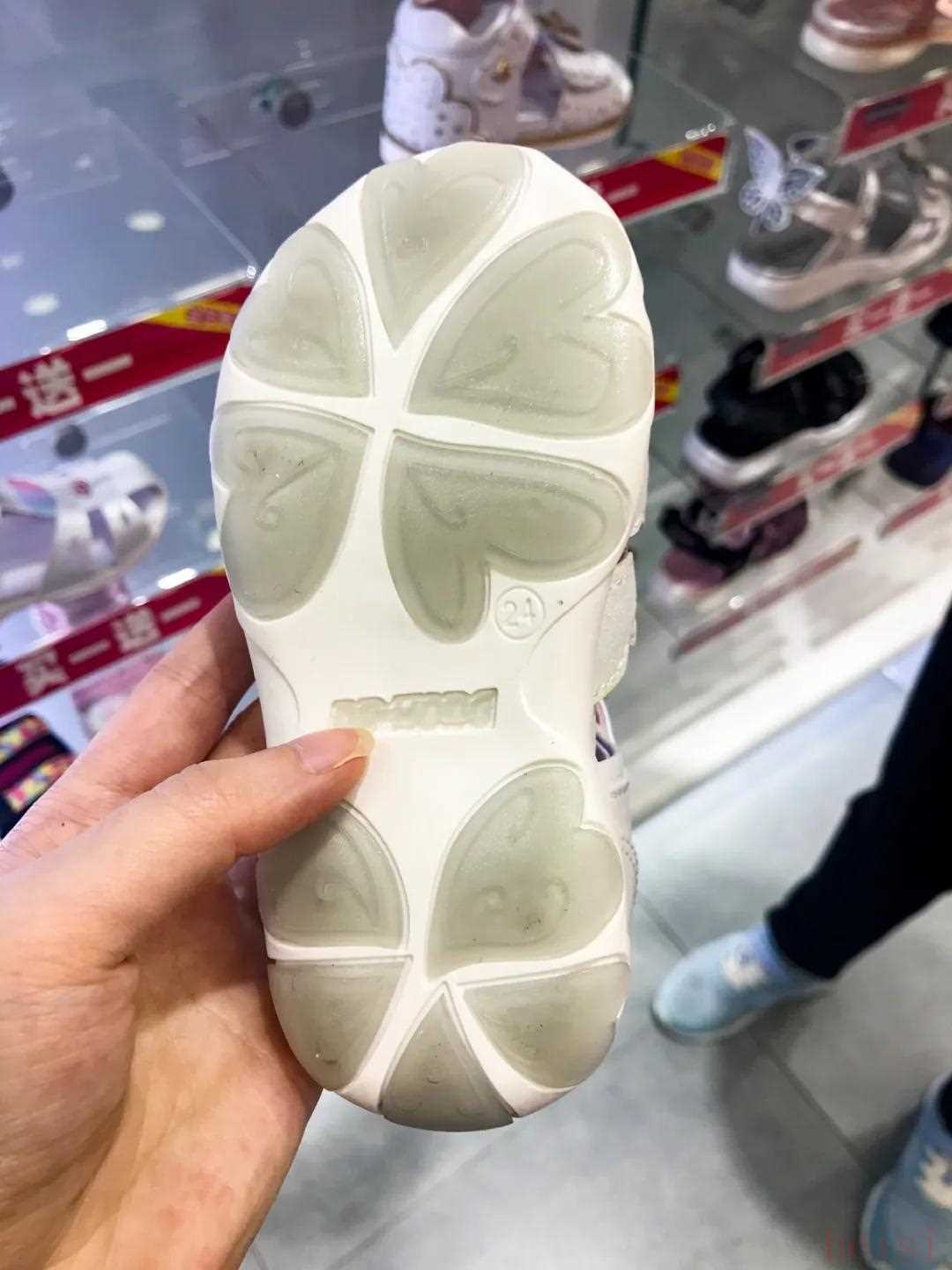 這款白色愛心款是比較符合兒童涼鞋選購(gòu)原則的,但鞋體還是略微偏硬。