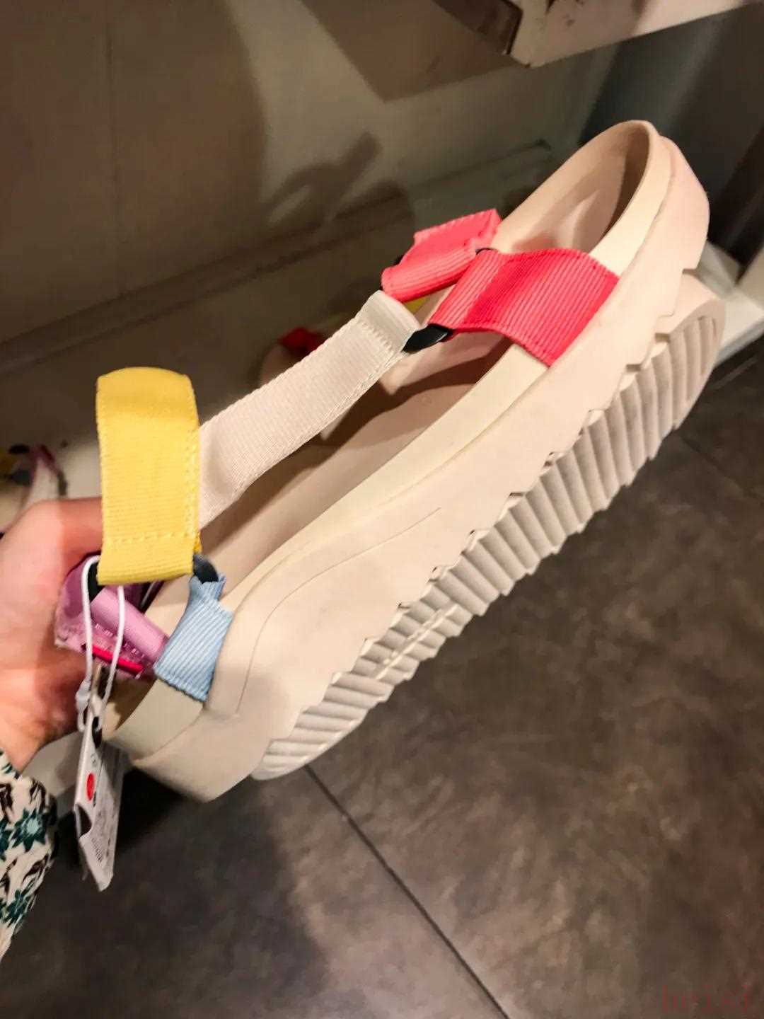 運(yùn)動(dòng)款的涼鞋配色活潑,自重不輕,上腳還算舒服,鞋跟雖厚但有效跟高沒有超過2.5cm。