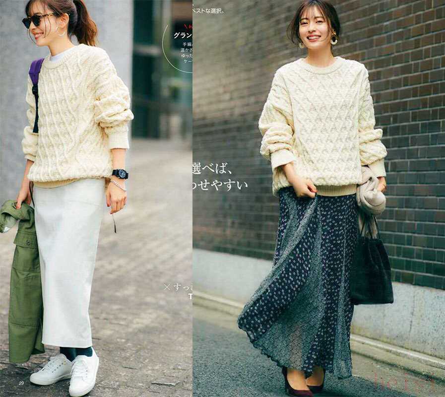 穿絞花、粗棒針織時(shí),可以搭配垂墜的碎花裙、富有光澤的半身裙,上厚下輕薄,利落又輕盈,將袖子挽起一部分,笨重的粗棒針織也不會(huì)顯得呆板木訥。