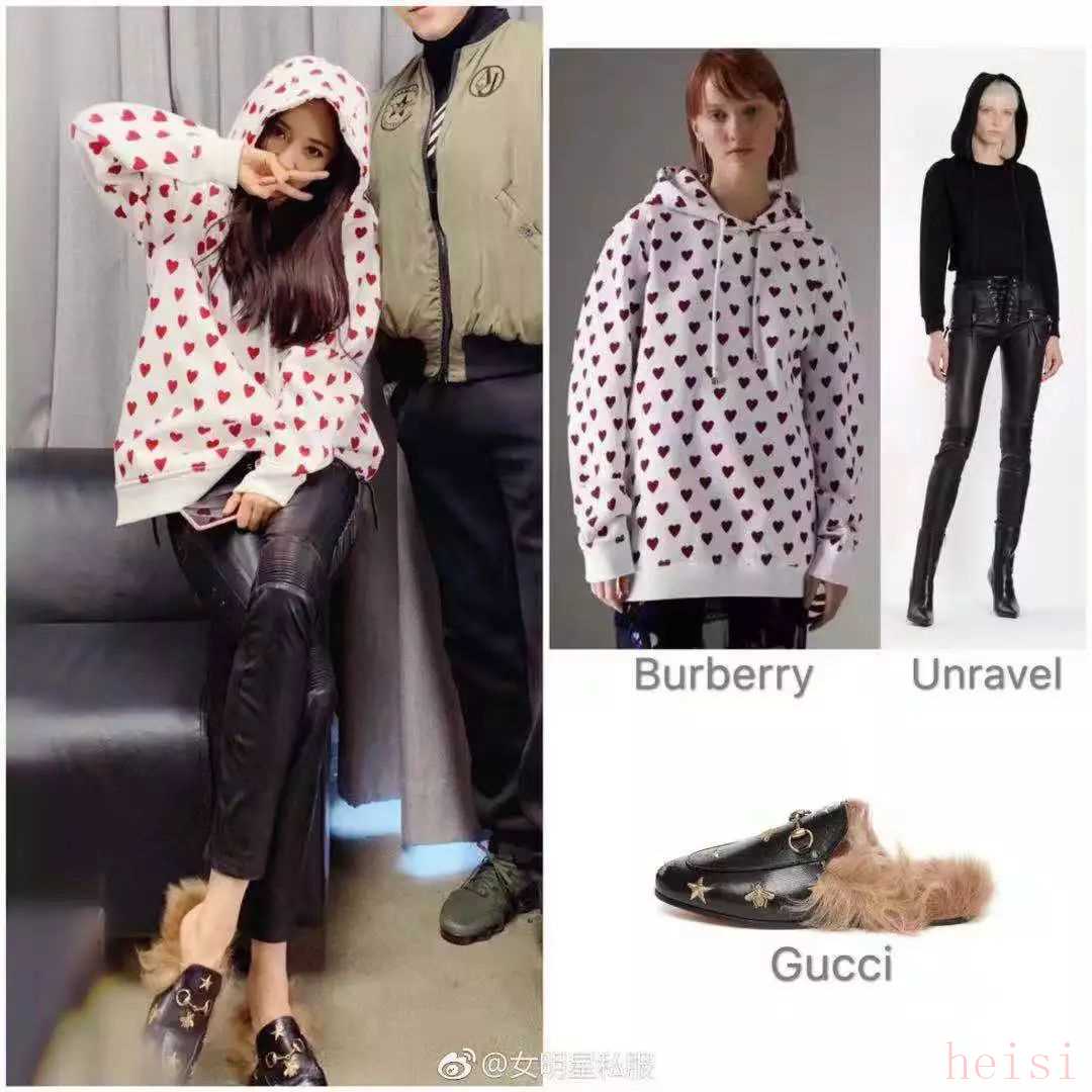 大冪冪的另一套工作私服則是選擇了Burberry的桃心衛(wèi)衣和Unravel的黑色皮褲,上腳Gucci的Princetown系列拖鞋,充滿少女感的隨性中又不缺乏精致。
