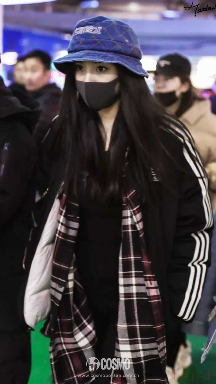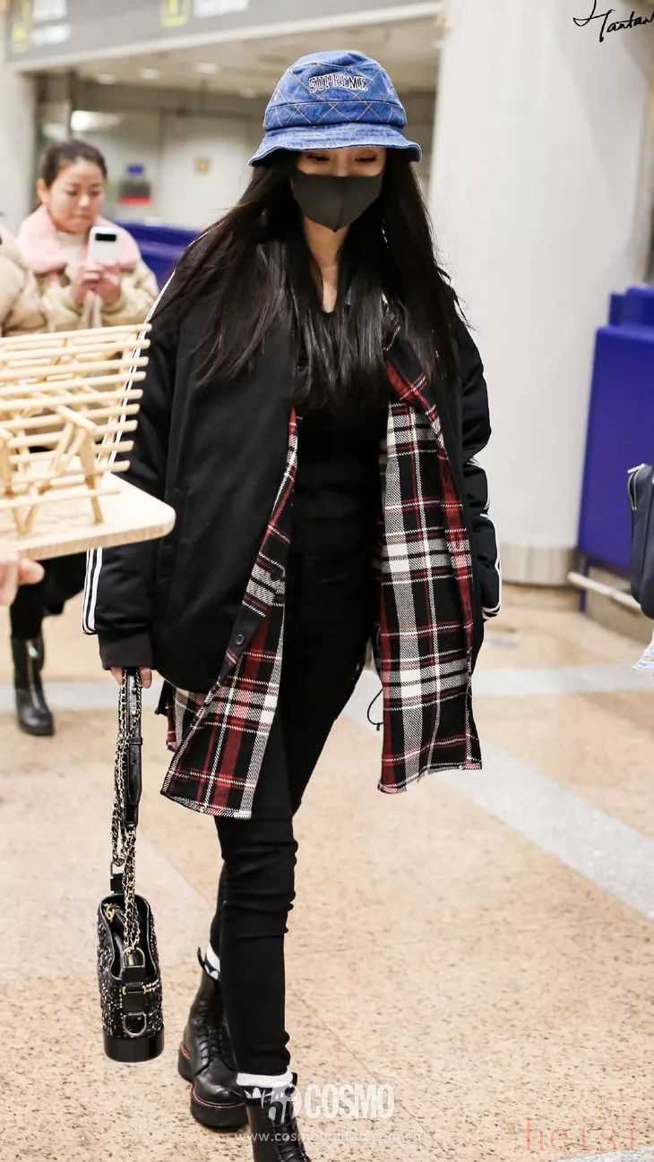 大冪冪在離開長沙的時(shí)候,選擇了Fear of God的oversize格子襯衫,內(nèi)搭黑TEE,外搭依舊是Adidas黑色運(yùn)動(dòng)外套。紅色格子襯衫為其他ALL BLACK的衣服選擇增添了活力,不會(huì)顯得沉悶。最近,漁夫帽真的是各路明星的鐘愛之選,實(shí)用又百搭,這次大冪冪選擇了Supreme的牛仔藍(lán)漁夫帽,漁夫帽的選擇COCO認(rèn)為給這身搭配加了大大的分,有種瞬間減齡的效果。