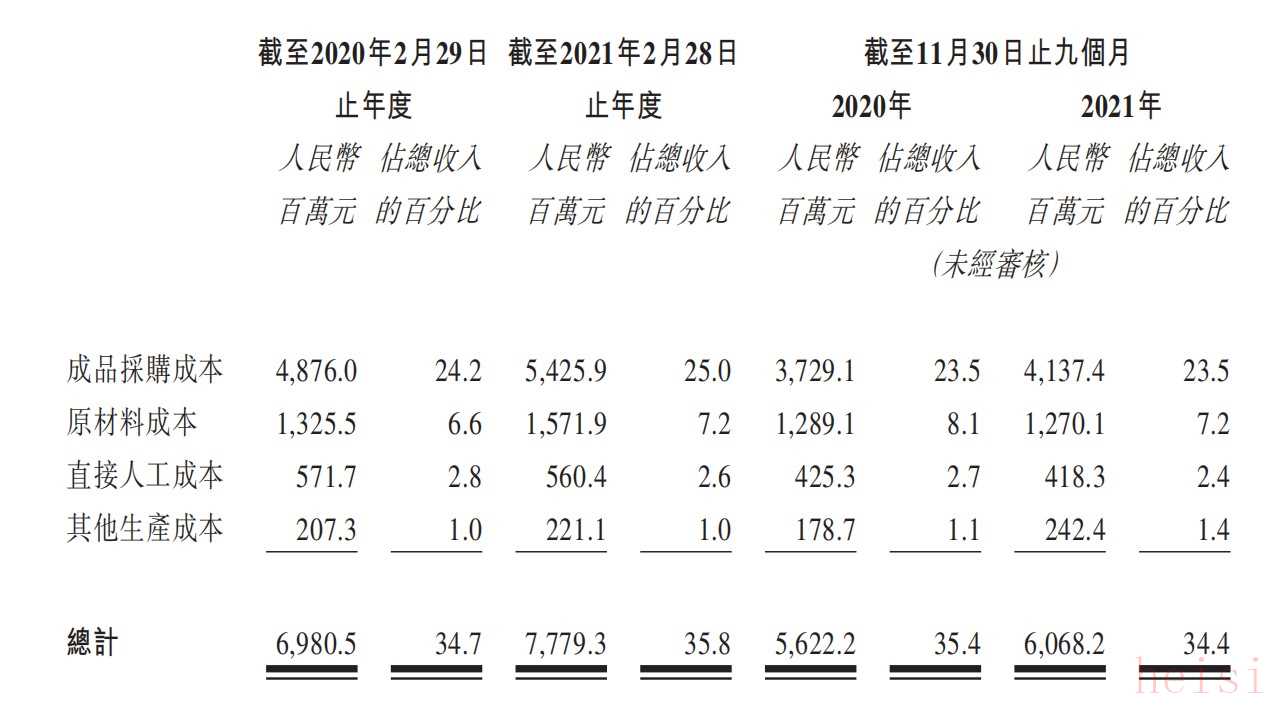 百麗時(shí)尚的銷售及生產(chǎn)成本一年高達(dá)162億元,占收入比重接近75%。截至2021年2月28日止財(cái)年,百麗時(shí)尚的銷售及營(yíng)銷支出總計(jì)84.4億元。成品及原材料的采購(gòu)、生產(chǎn)等成本總計(jì)77.8億元,而同期經(jīng)營(yíng)活動(dòng)所產(chǎn)生的現(xiàn)金凈額為44.3億元,遠(yuǎn)不及采購(gòu)及生產(chǎn)成本。