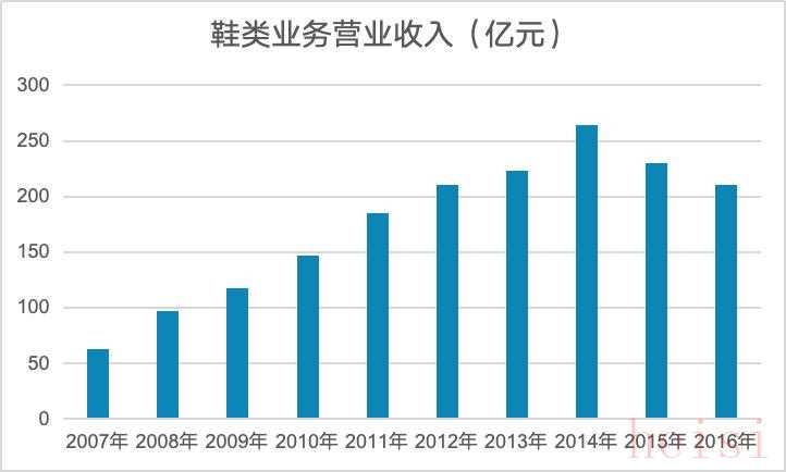 鞋類業(yè)務收入自2014年起達到頂峰之后,2015、2016 年出現(xiàn)下滑,進入瓶頸期。