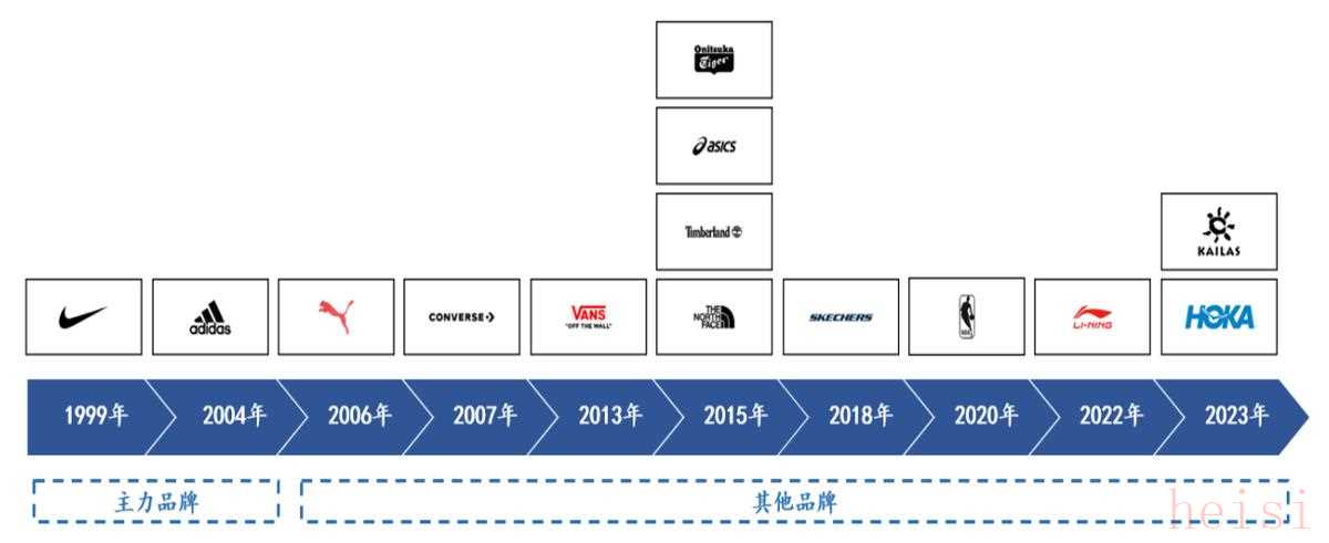 - 2003、2004 年開始代理新百倫(New Balance)和阿迪達斯