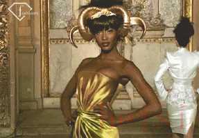 他給模特們穿上古希臘神話里的白裙,戴上金首飾,秀場上帶著麥昆一如既往的侵略性。