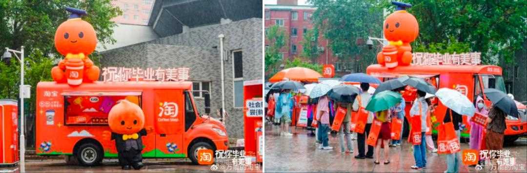 以淘寶吉祥物“淘公仔”為例,這個橙色小人早就跳出了電商平臺的單一符號,成為穿梭于多元場景的“生活陪伴者”。2023年杭州地鐵的“橙包計劃”,立體淘公仔以“靠墊”“出氣筒”形態(tài)出現(xiàn),治愈節(jié)后上班的打工人;今年的畢業(yè)季,淘公仔將橙色大巴開進大學,給即將畢業(yè)的大學生們派發(fā)免單美式卡,送上“祝你畢業(yè)有美事”的祝福……正是一次次向日常生活場景的滲透,讓淘公仔參與大眾的日常情緒、人生片段,讓大眾對其從“知道”到“記得”,從“熟悉”到“親近”。