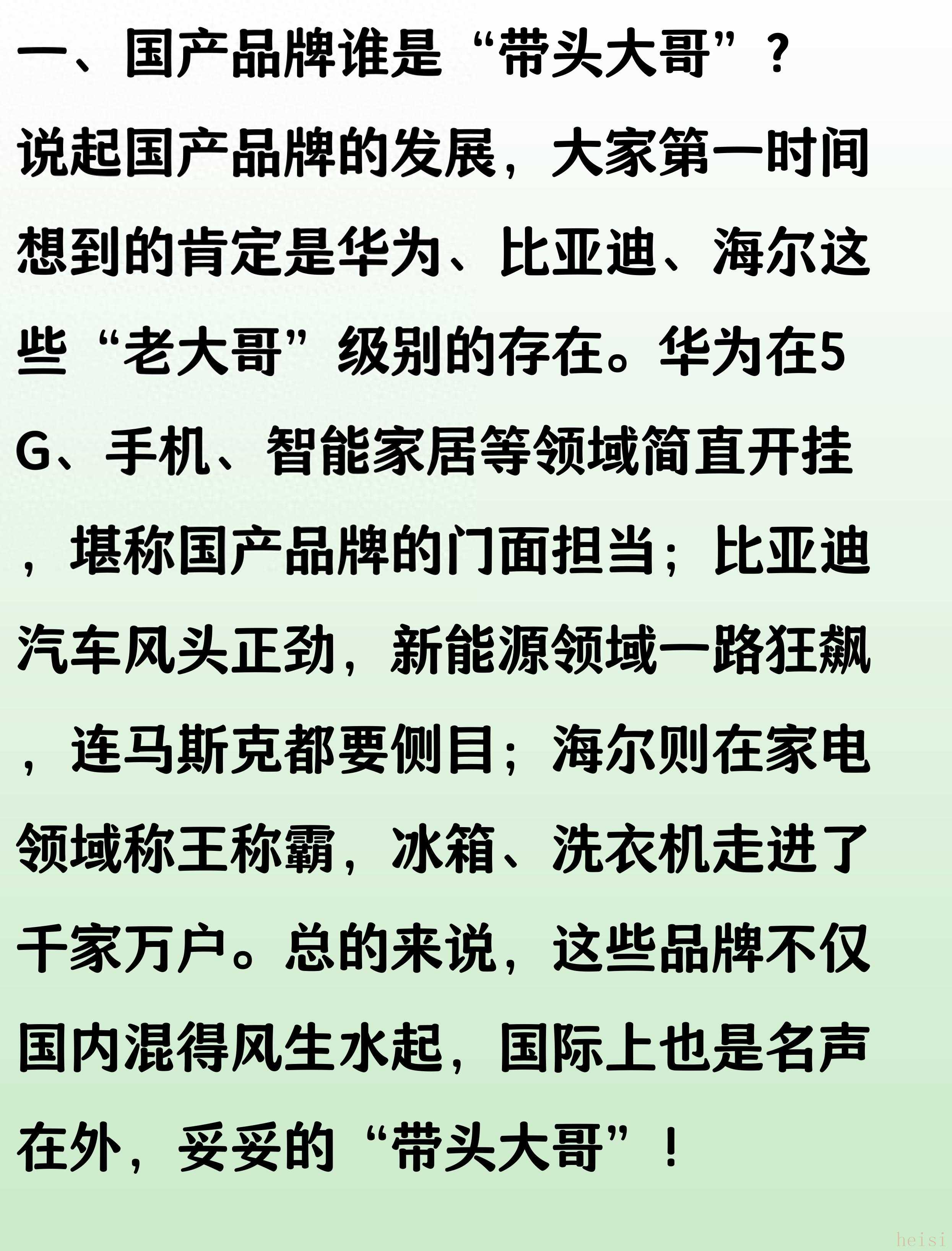 國(guó)產(chǎn)品牌的發(fā)展?fàn)顩r是多方面的,涉及多個(gè)行業(yè)和領(lǐng)域。以下是一些在各自領(lǐng)域內(nèi)表現(xiàn)優(yōu)異、具有發(fā)展?jié)摿Φ膰?guó)產(chǎn)品牌: