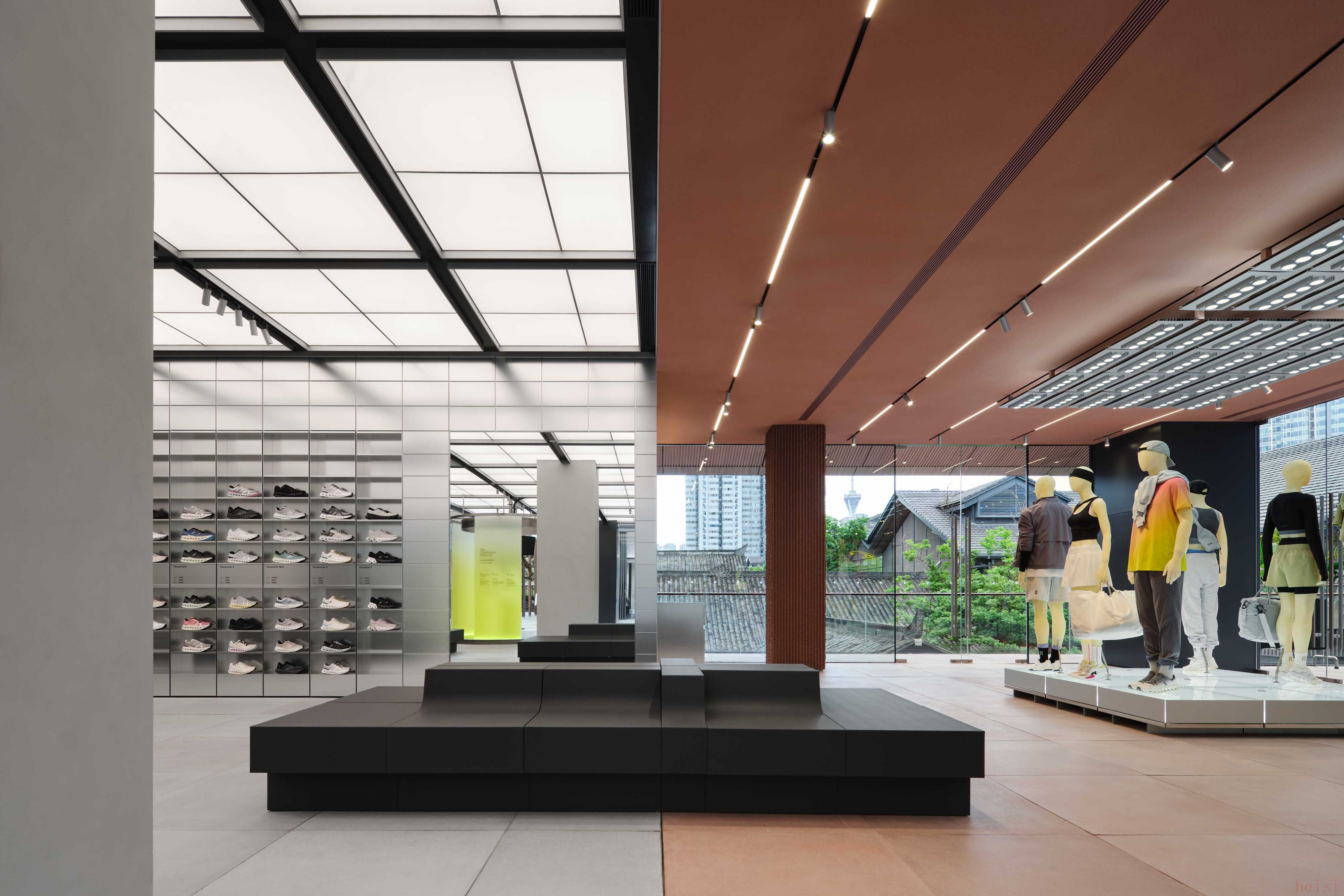 On昂跑成都旗艦店的設(shè)計(jì)將科技創(chuàng)新與在地文化巧妙融合,以“竹”為核心設(shè)計(jì)語(yǔ)言,天窗引入自然光影,營(yíng)造出兼具未來(lái)感與在地美學(xué)的零售體驗(yàn)。旗艦店展示了跑步、健身、戶外、網(wǎng)球及運(yùn)動(dòng)生活五大場(chǎng)景。