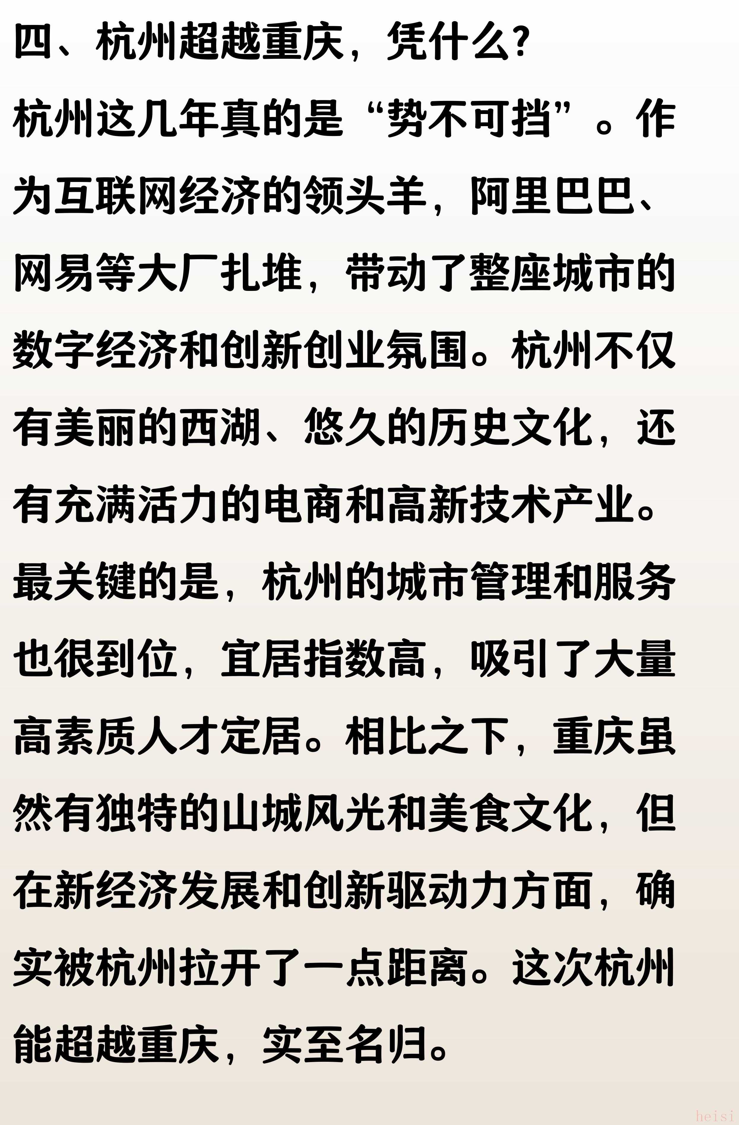 3. 杭州超重慶:這句話表明在某個(gè)評(píng)價(jià)體系或調(diào)查中,杭州的城市品牌影響力超過(guò)了重慶。