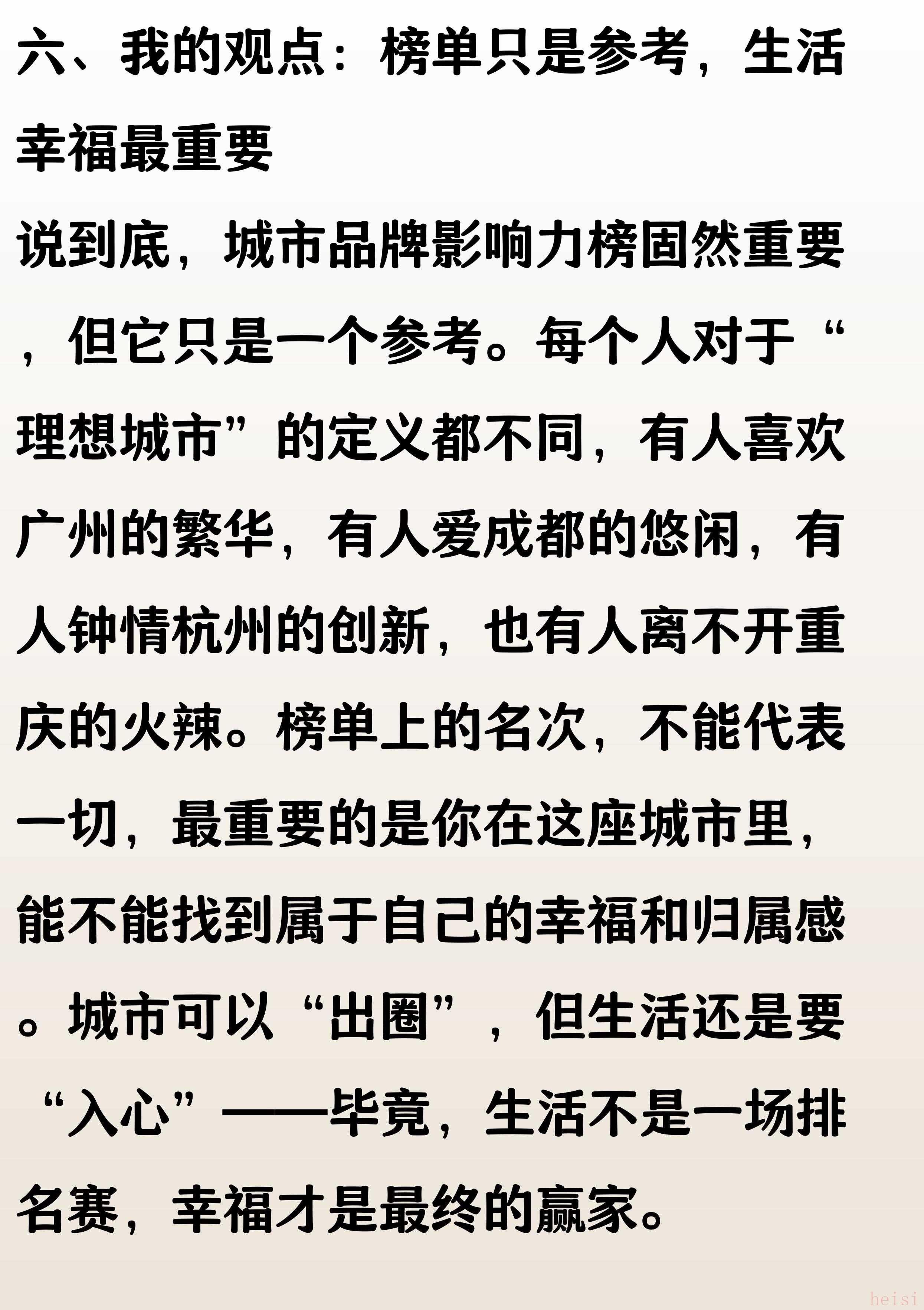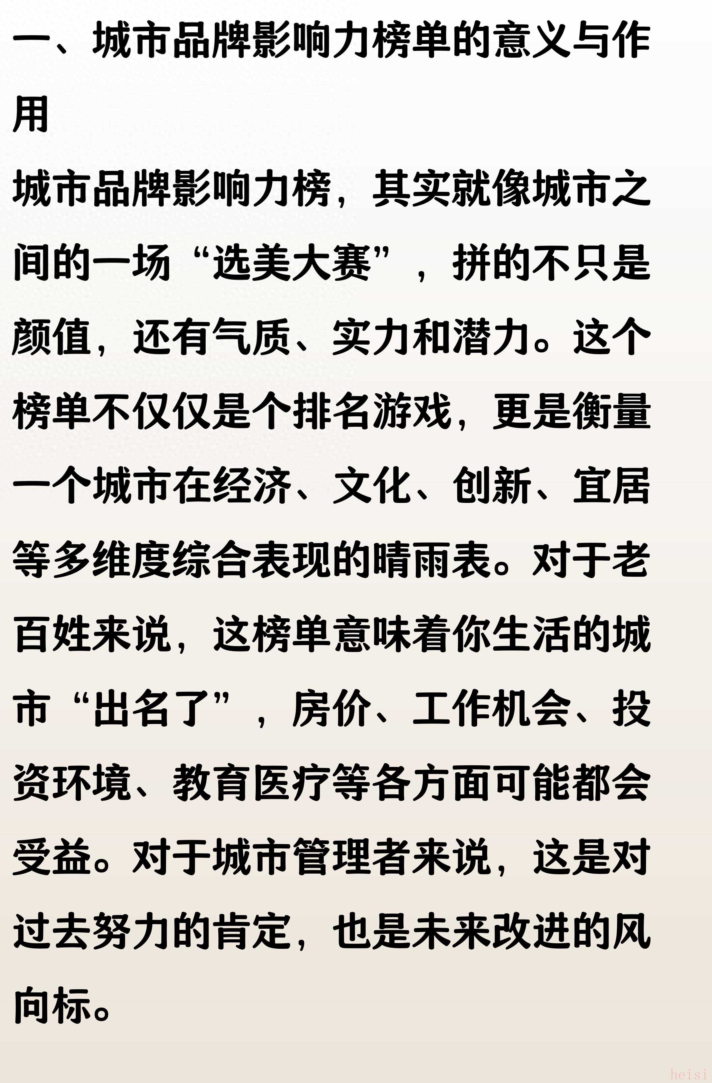 需要注意的是,城市品牌影響力是一個(gè)綜合性的概念,可能包括經(jīng)濟(jì)實(shí)力、文化底蘊(yùn)、創(chuàng)新能力、國(guó)際影響力等多個(gè)方面。因此,不同評(píng)價(jià)體系可能會(huì)得出不同的排名結(jié)果。