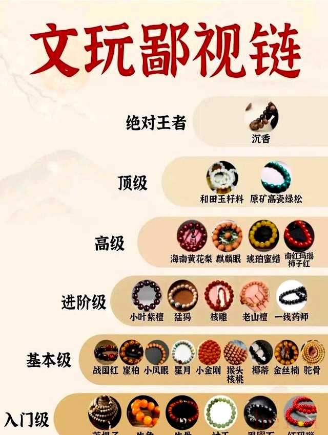 手串在中國文化中有著悠久的歷史,不同的手串代表著不同的文化和寓意。以下是一些世界知名的手串及其段位,但請(qǐng)注意,這個(gè)“段位”并不是一個(gè)正式的分類,而是根據(jù)手串的稀有性、歷史價(jià)值和文化意義進(jìn)行的一種非正式劃分。