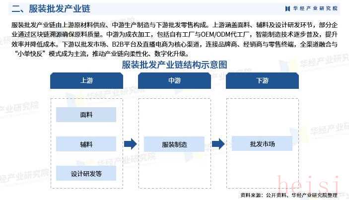 服裝批發(fā)產(chǎn)業(yè)鏈由上游原材料供應(yīng)、中游生產(chǎn)制造與下游批發(fā)零售構(gòu)成。上游涵蓋面料、輔料及設(shè)計(jì)研發(fā)環(huán)節(jié),部分企業(yè)通過區(qū)塊鏈溯源確保原料質(zhì)量。中游為成衣加工,包括自有工廠與OEM/ODM代工廠,智能制造技術(shù)逐步普及,提升效率并降低成本。下游以批發(fā)市場(chǎng)、B2B平臺(tái)及直播電商為核心渠道,連接品牌商、經(jīng)銷商與零售終端,全渠道融合與“小單快反”模式成為主流,推動(dòng)產(chǎn)業(yè)鏈向柔性化、數(shù)字化升級(jí)。