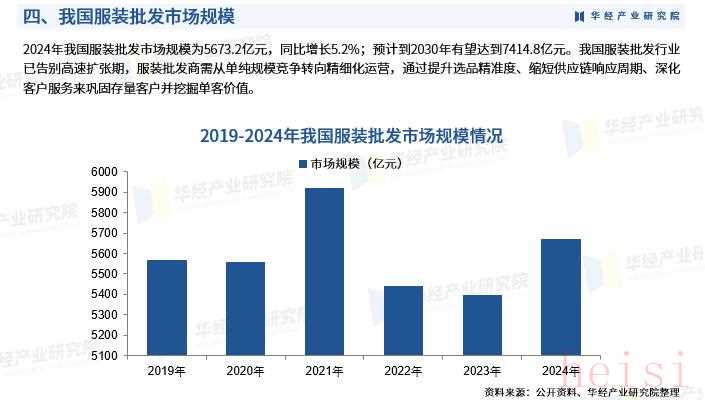 2024年我國(guó)服裝批發(fā)市場(chǎng)規(guī)模為5673.2億元,同比增長(zhǎng)5.2%;預(yù)計(jì)到2030年有望達(dá)到7414.8億元。我國(guó)服裝批發(fā)行業(yè)已告別高速擴(kuò)張期,服裝批發(fā)商需從單純規(guī)模競(jìng)爭(zhēng)轉(zhuǎn)向精細(xì)化運(yùn)營(yíng),通過提升選品精準(zhǔn)度、縮短供應(yīng)鏈響應(yīng)周期、深化客戶服務(wù)來鞏固存量客戶并挖掘單客價(jià)值。