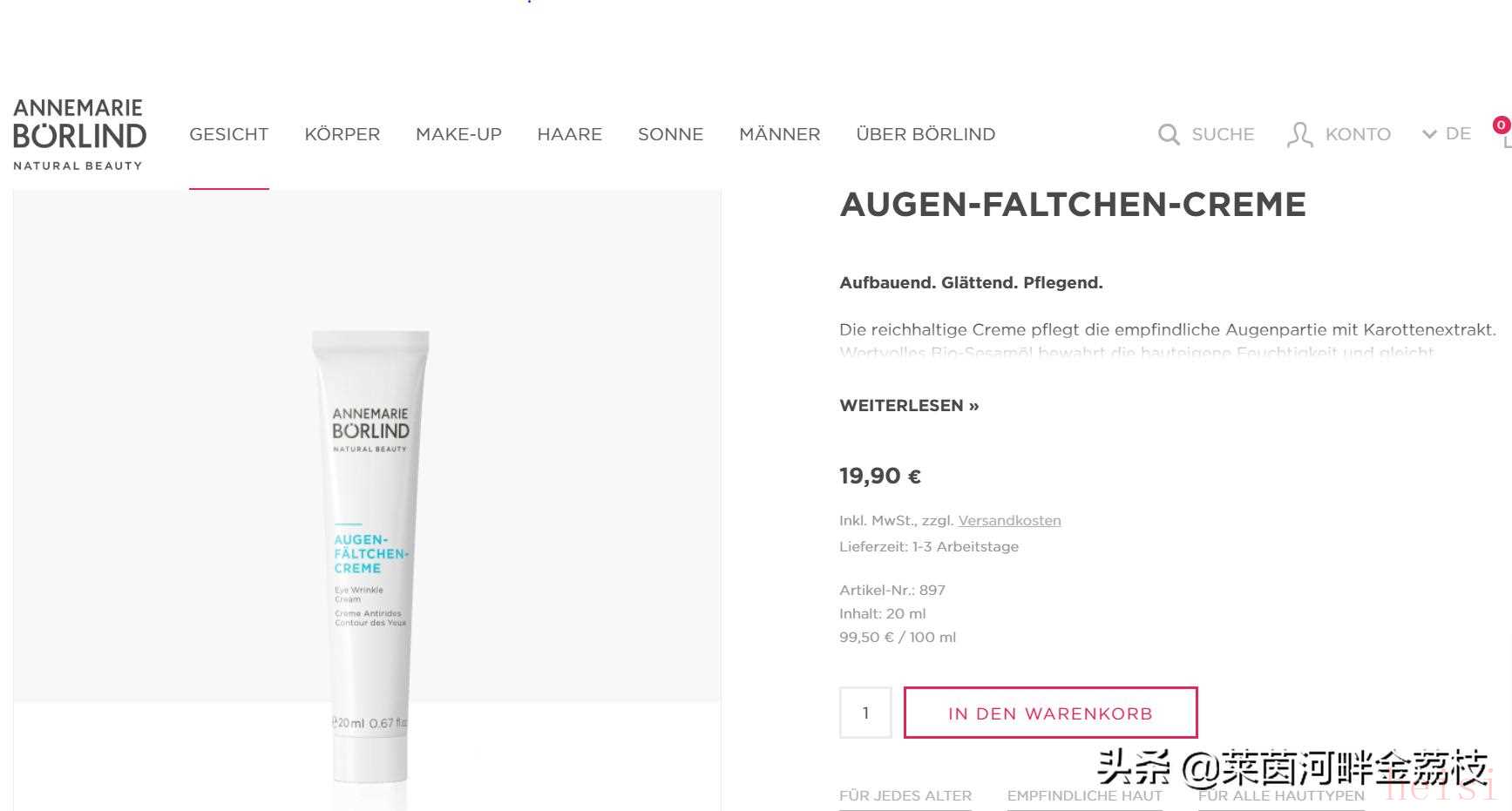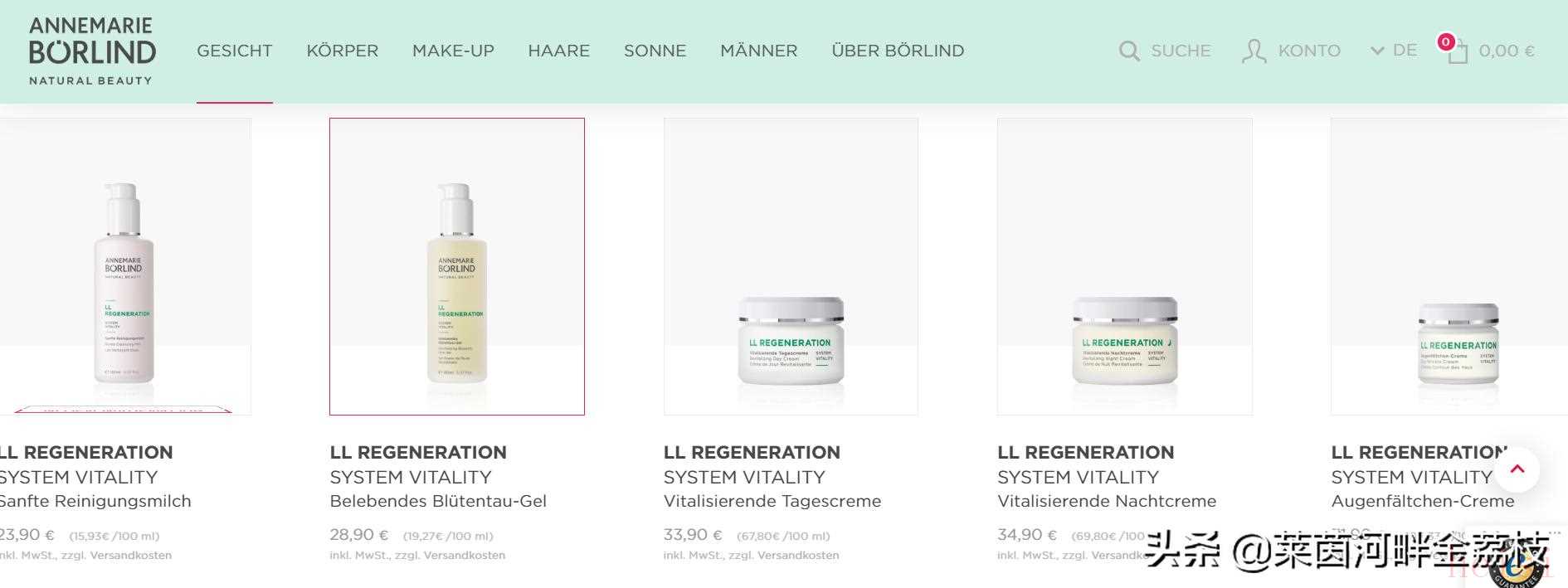 這個(gè)截圖是安娜柏林的官網(wǎng)售價(jià),最便宜的洗面奶是23.9歐,最貴的算是晚霜34.9歐,基本也是30歐左右的,這樣的一套下來,也是1000多到手吧。當(dāng)然安娜柏林的系列很多,還有適合20幾歲的玫瑰系列,補(bǔ)水系列,適合混油的妍展系列等等。但是30幾歲是護(hù)膚品購買的主力軍,所以最火的系列就是再生系列,能夠延緩衰老,尤其那個(gè)再生眼霜,號(hào)稱眼部小熨斗,堅(jiān)持使用可以淡化眼角的細(xì)紋。不過最好還是預(yù)防在先,很多人不到30就開始用眼霜,那可以選擇安娜柏林的小白管多功能眼霜,去黑眼圈,去小細(xì)紋,把第一條小細(xì)紋就扼殺在萌芽之中。德國售價(jià)是19.9歐,國內(nèi)售價(jià)一般不到200。