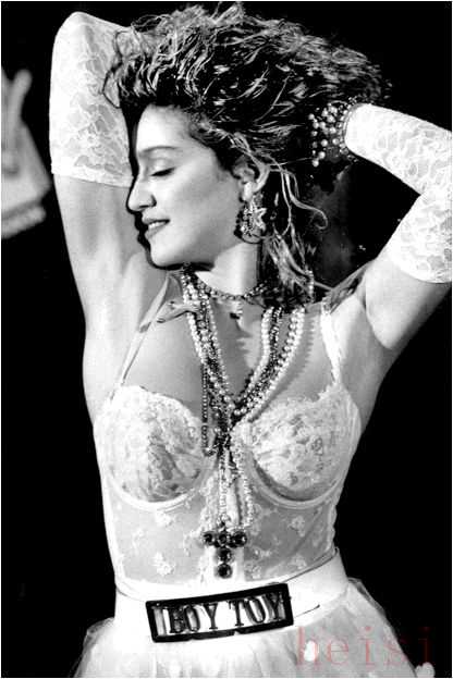 1984年MTV VMA 頒獎典禮現場造型, “Boy Toy” 在未來很長一段時間內成了Madonna 的綽號, 數年后, 成為了她自己巡演制作公司的名稱