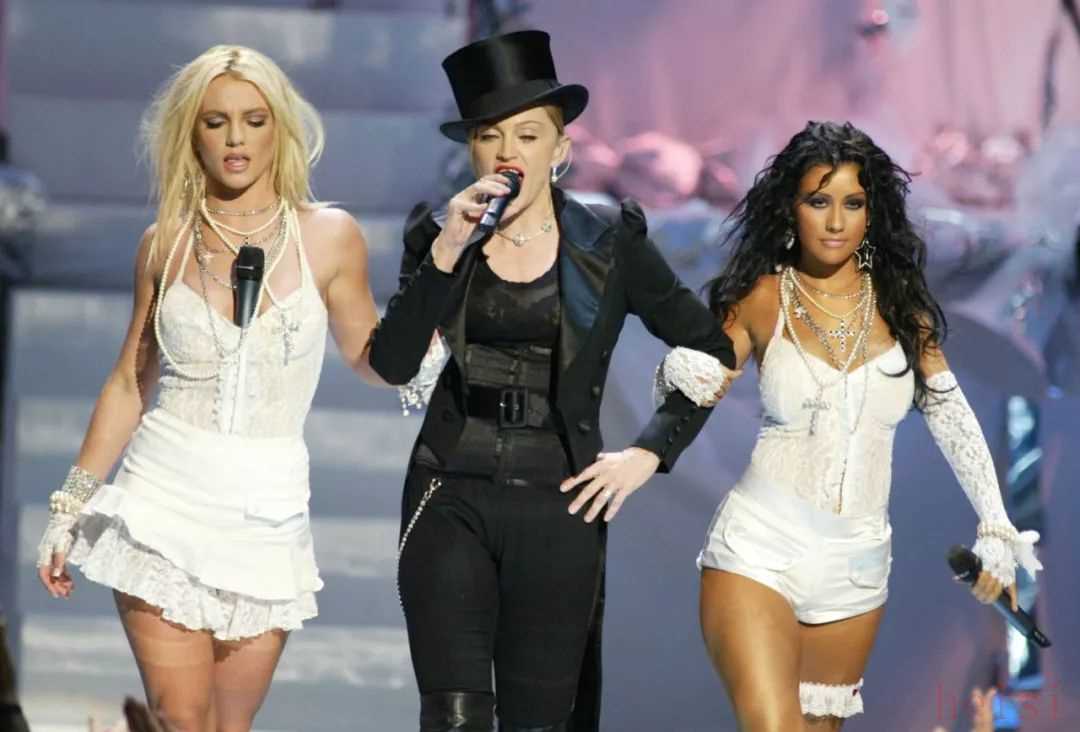 45歲的她依然占領著各大媒體,但顯然沒有那么太平。首先, 就是 MTV VMA 二十周年的舞臺上, 復刻了第一屆 Madonna 的開場舞臺: 巨大的蛋糕緩緩升起, 身著超短裙類似婚紗的女歌手緩緩升起 —— 只是這次, "新娘"換成了當下最熱的兩位新生代小天后 Christina Aguilera 和 Britney Spears, 而作為"新郎"的 Madonna 出場, 與兩位"新娘"熱舞。
