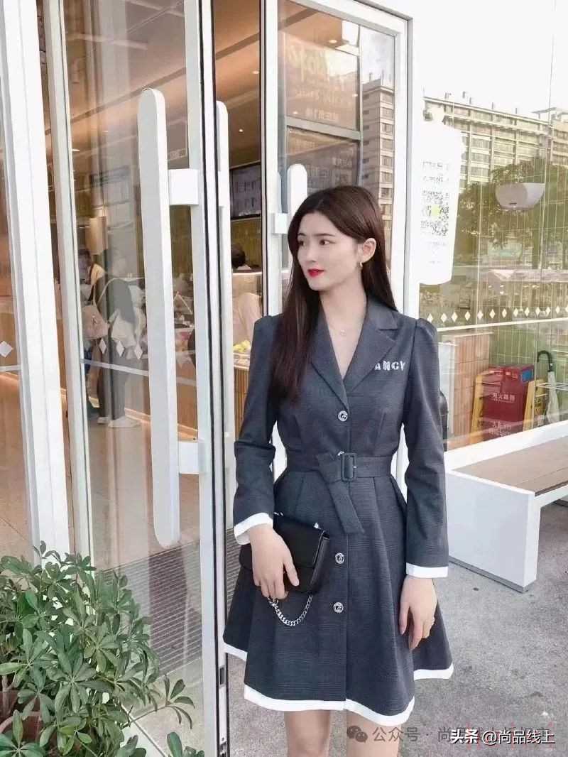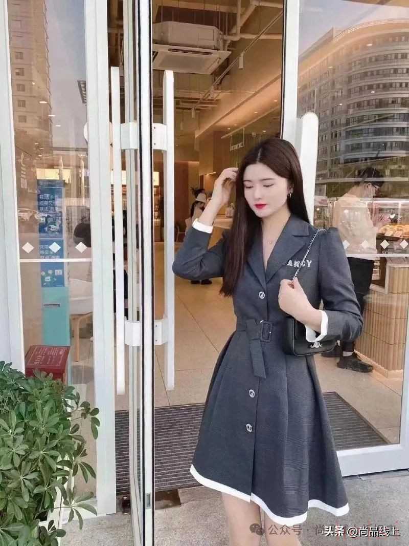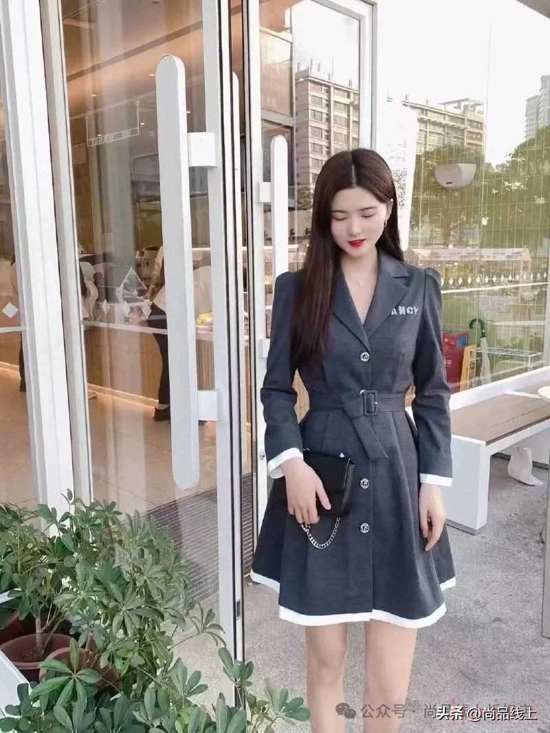 這款西裝式連衣裙,深灰色調(diào)干練高級,西裝領(lǐng)設(shè)計(jì)經(jīng)典利落。精致紐扣搭配字母裝飾,增添時(shí)尚細(xì)節(jié)感,收腰剪裁勾勒身形