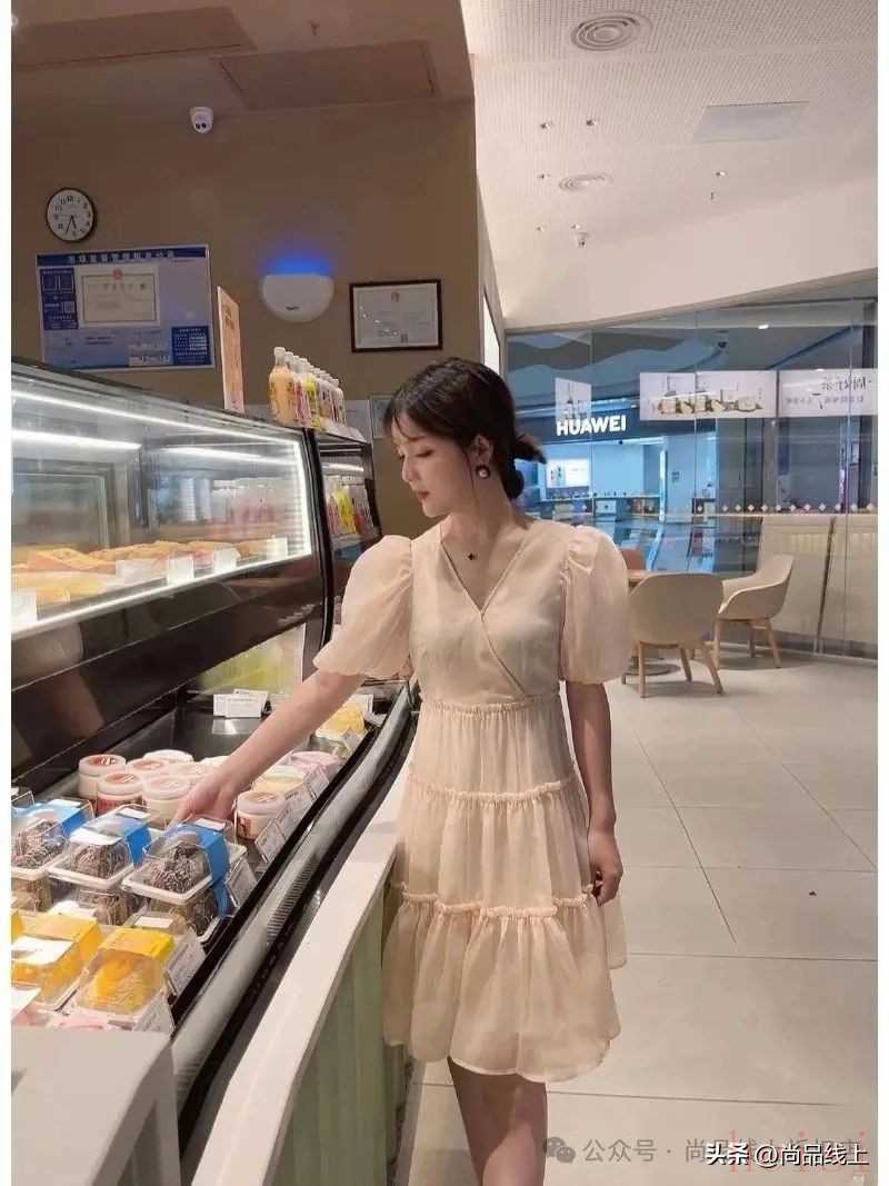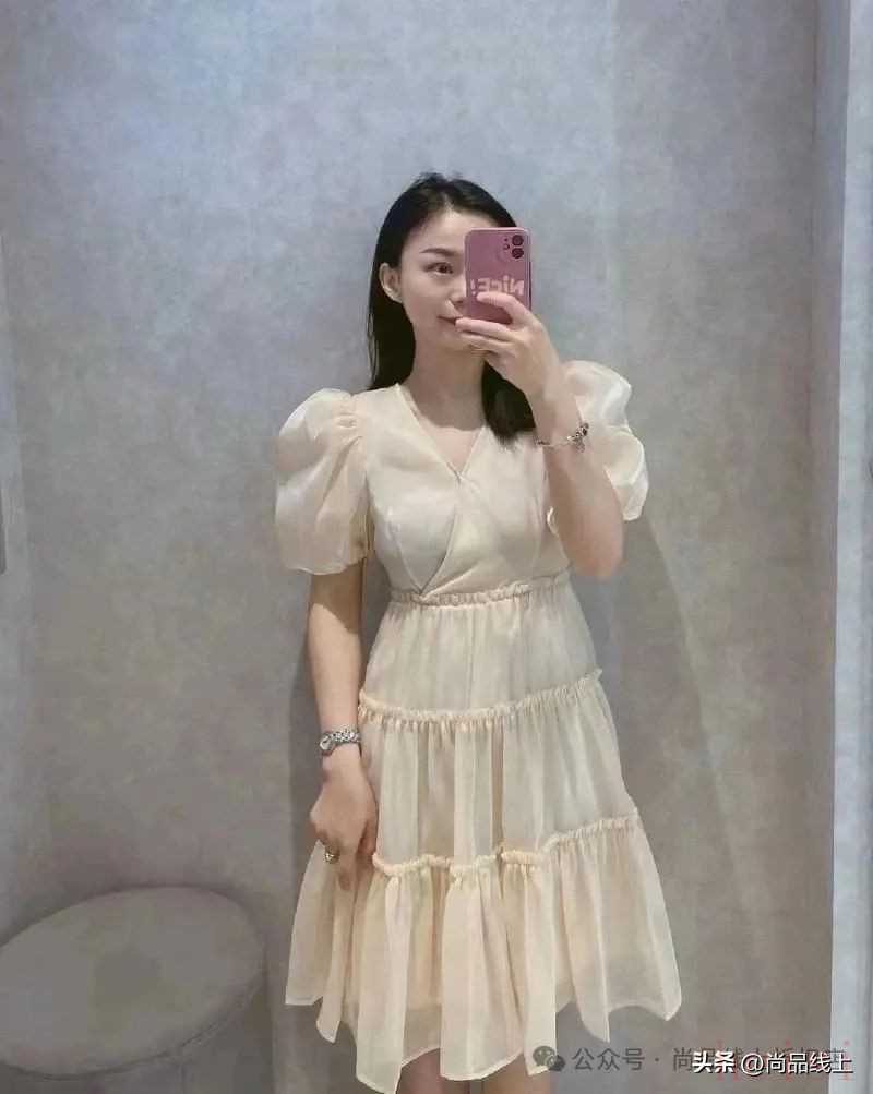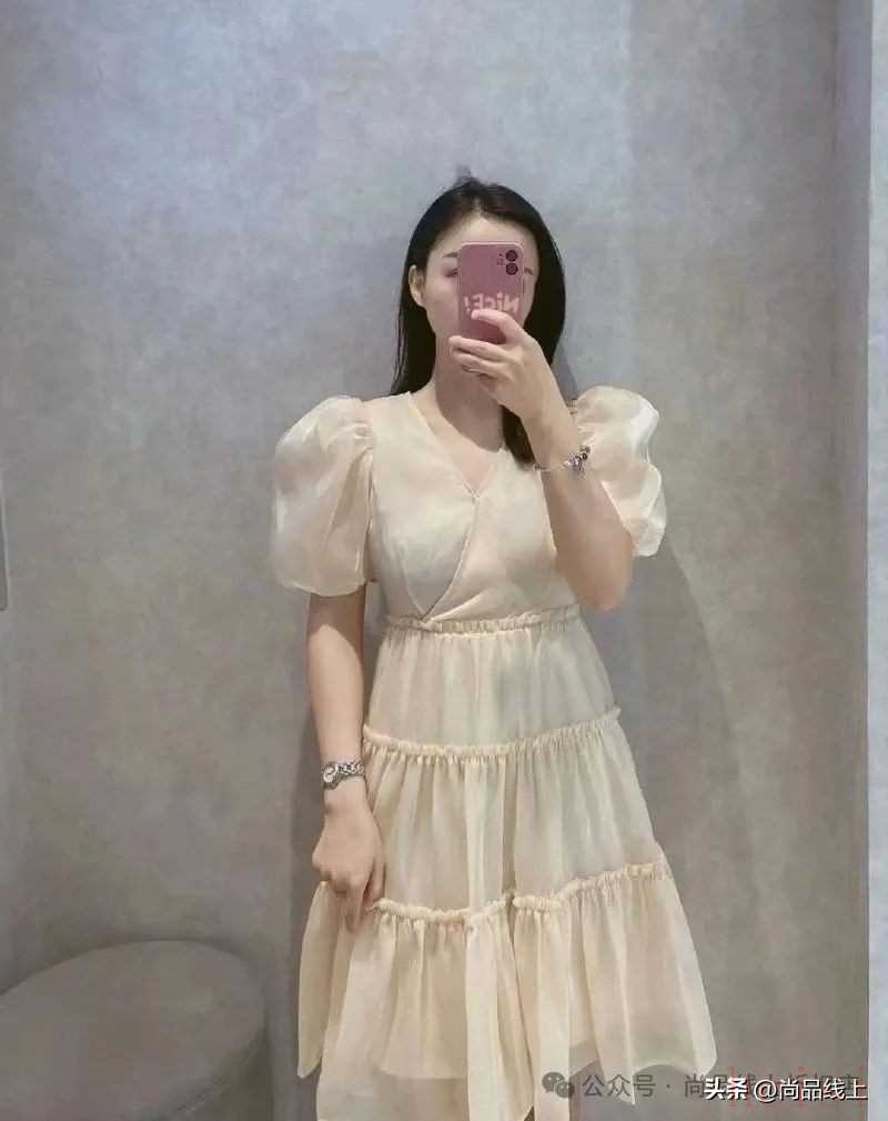 這款淺米色連衣裙,V領(lǐng)設(shè)計(jì)優(yōu)雅顯鎖骨,泡泡袖增添甜美氛圍。多層荷葉邊裙擺輕盈靈動,仿佛自帶仙氣,網(wǎng)紗面料通透有質(zhì)感。