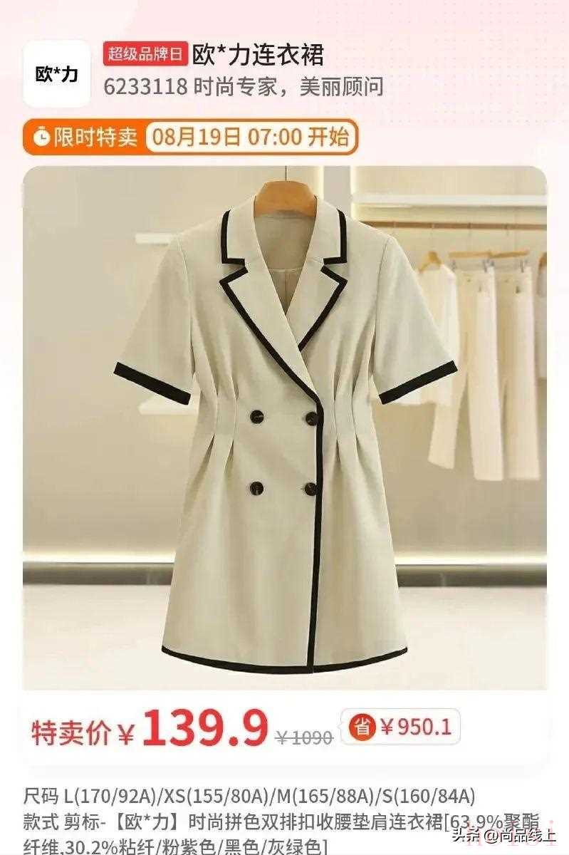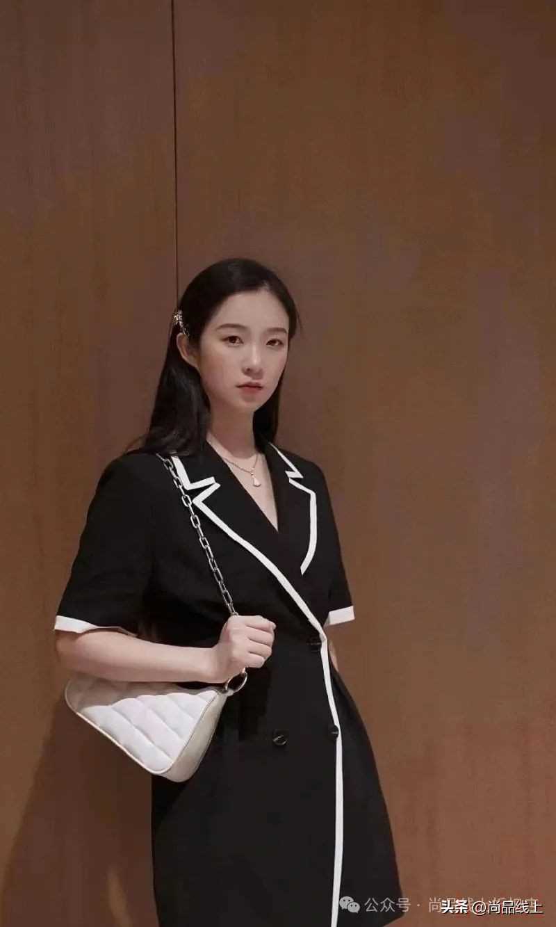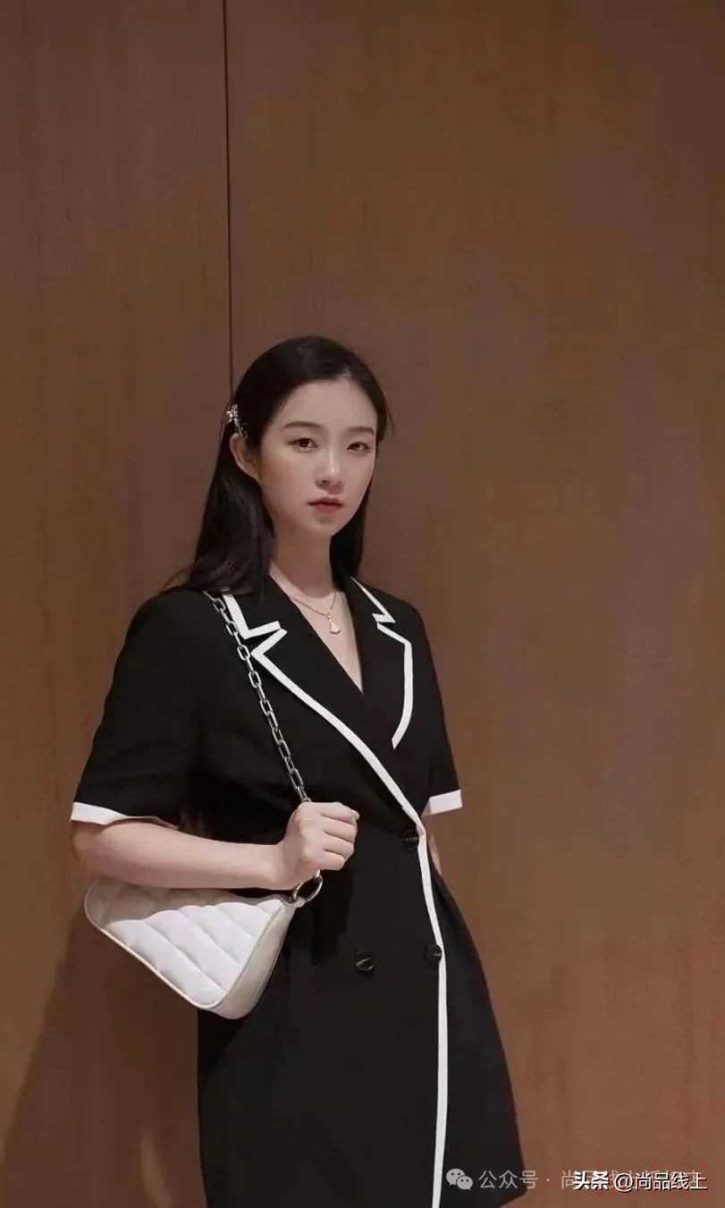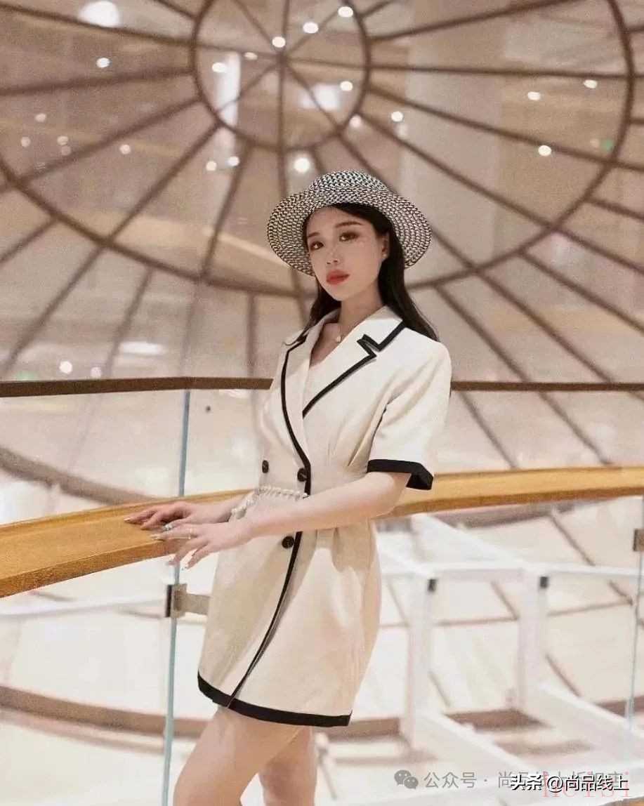這款西裝式連衣裙,淺米色主調(diào)優(yōu)雅大氣,黑色包邊精致亮眼,打造經(jīng)典撞色效果。西裝領(lǐng)、雙排扣設(shè)計(jì),兼具干練與時(shí)尚感,收腰剪裁巧妙勾勒身形,短袖適配多種場合。