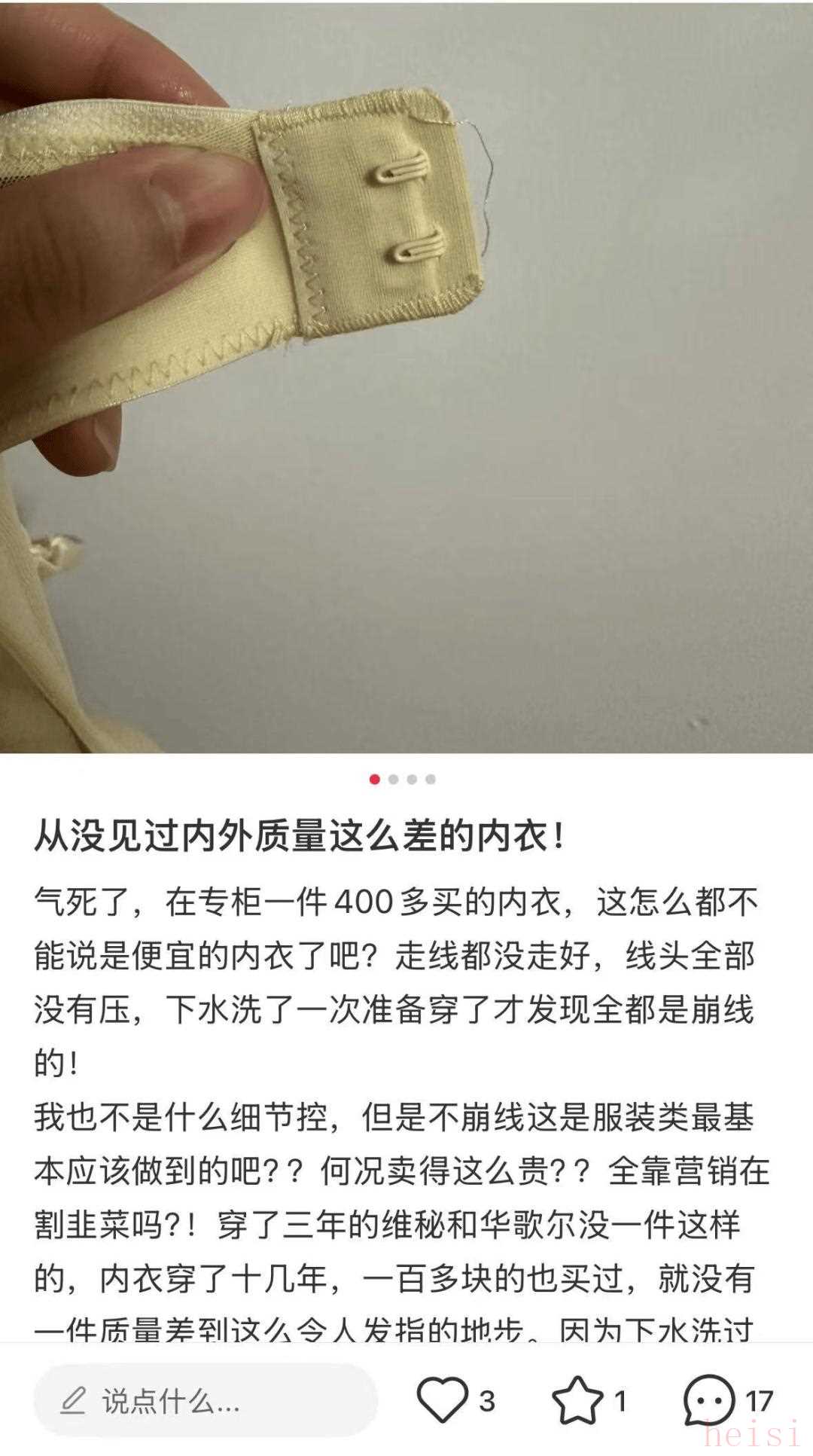 但如今,“舒適度”已不再是稀缺賣點(diǎn),Ubras、維多利亞的秘密、愛慕、曼妮芬等同樣位于商場的文胸品牌也紛紛在舒適賽道發(fā)力。而蕉內(nèi)、蕉外、優(yōu)衣庫、無印良品等品牌,更以高性價(jià)比推出了兼具舒適度的無鋼圈產(chǎn)品。2、內(nèi)容頻頻出圈,質(zhì)量卻飽受詬病